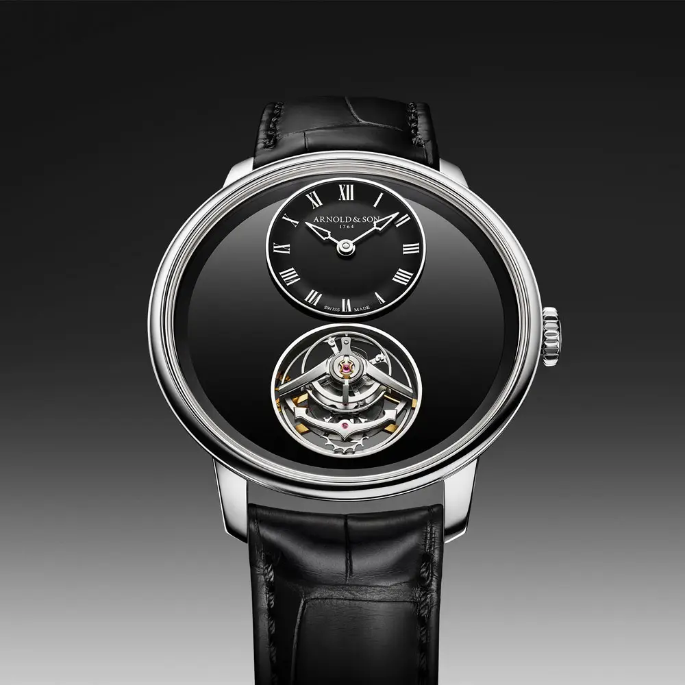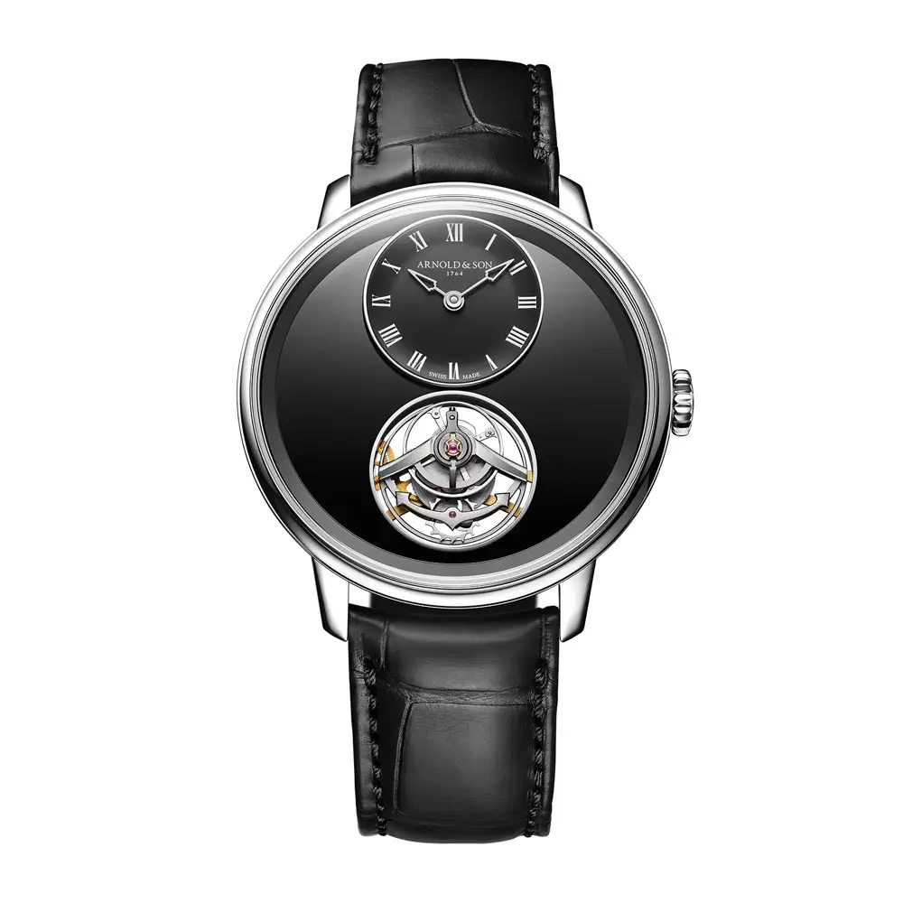 Модель Arnold & Son Ultrathin Tourbillon Platinum Onyx 1UTBX.Z03A.C1375C от Arnold & Son представляет вершину haute horlogerie, сочетая высочайшее техническое мастерство и изысканный дизайн. Корпус из платины 950 диаметром 41,5 мм отличается ультратонким профилем всего 8,40 мм, что является выдающимся достижением для часов с турбийоном. Элегантный циферблат из чёрного оникса создаёт глубокий контраст и подчёркивает асимметричную компоновку.