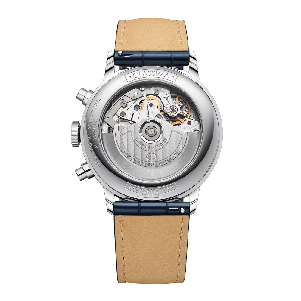 Baume & Mercier Classima M0A10330 сочетает классическую элегантность с техническим совершенством швейцарского часового искусства. Полированный стальной корпус диаметром 42 мм обрамляет серебристый циферблат с узором guilloché, тремя счетчиками и синими стрелками в форме листа, создавая гармоничный и утончённый облик. Синий ремешок из кожи аллигатора подчеркивает благородство и стиль.