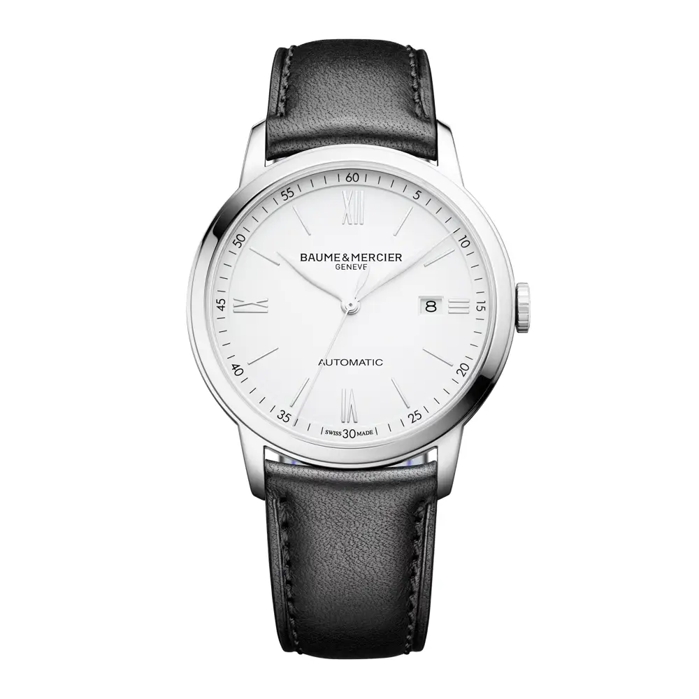 Baume & Mercier Classima M0A10332 сочетает классический стиль с современным изяществом. Полированный корпус из нержавеющей стали диаметром 42 мм обрамляет белый циферблат с римскими цифрами и изящными стрелками, подчеркивающими гармонию дизайна. Черный ремешок из телячьей кожи придает модели строгий и элегантный вид, подходящий для любого случая.