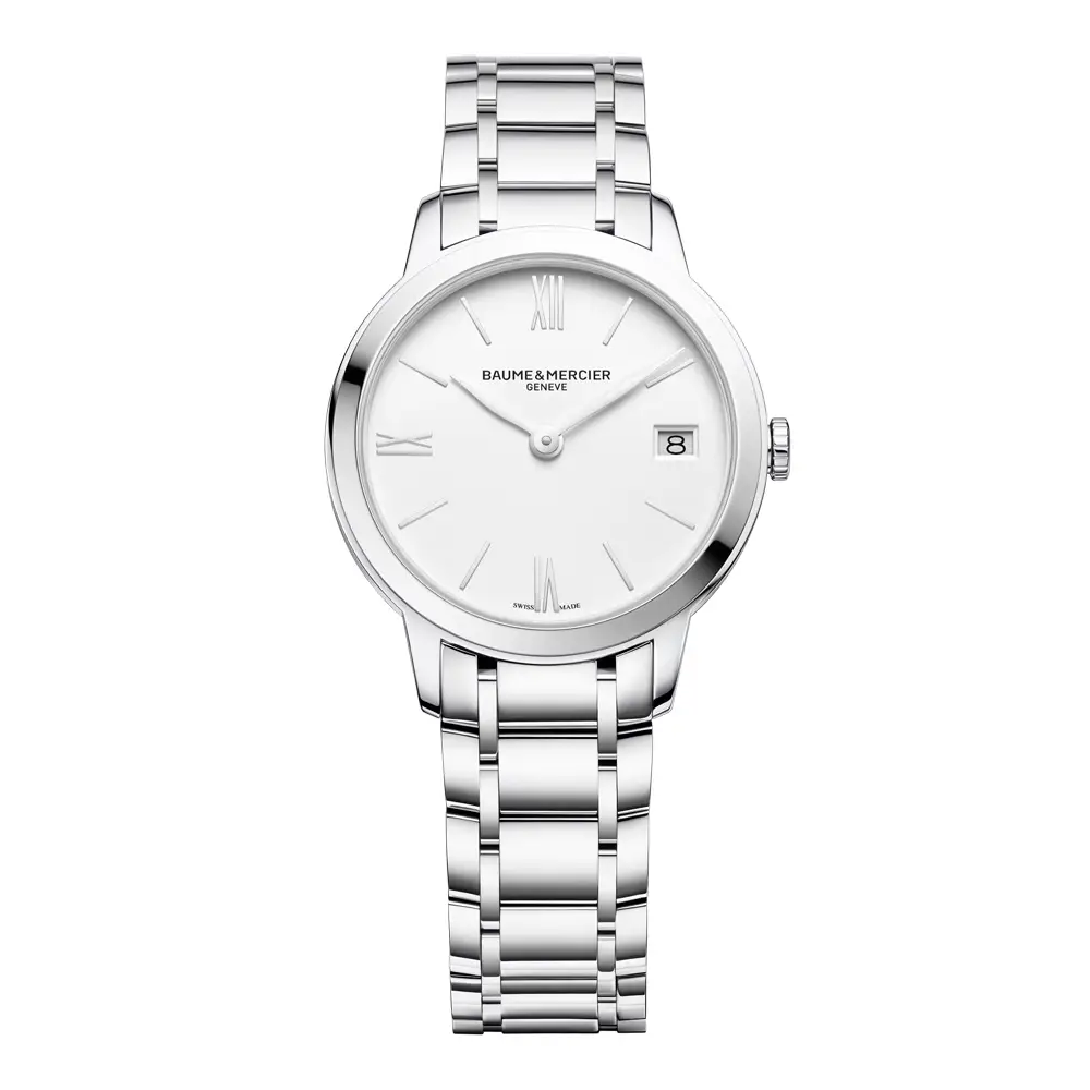 Baume & Mercier Classima M0A10335 сочетает классический дизайн и современную практичность. Корпус из нержавеющей стали диаметром 31 мм обрамляет белый циферблат с римскими цифрами и окном даты на отметке 3 часа. Полированный стальной браслет с тройной застёжкой подчёркивает элегантность и универсальность модели.