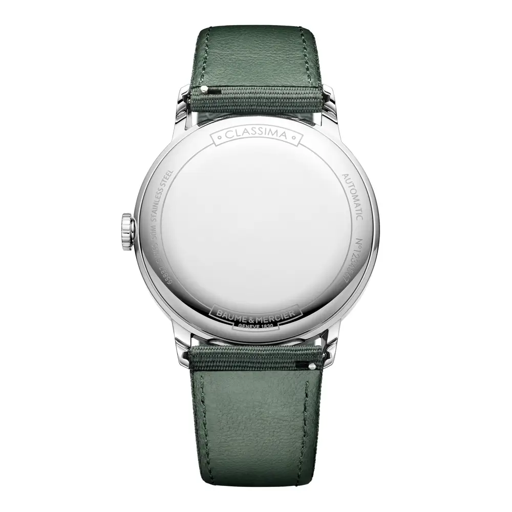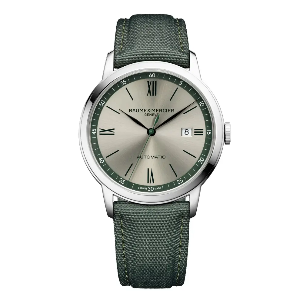 Серый циферблат украшен тонкими индексами и римскими цифрами на позициях 12, 3, 6 и 9 часов, создавая классический и чистый вид. Утонченные зеленые акценты по краю циферблата добавляют часам современный штрих и прекрасно сочетаются с текстильным ремешком оливково-зеленого цвета, который одновременно удобен и стилен. На позиции 3 часа расположен практичный указатель даты.
