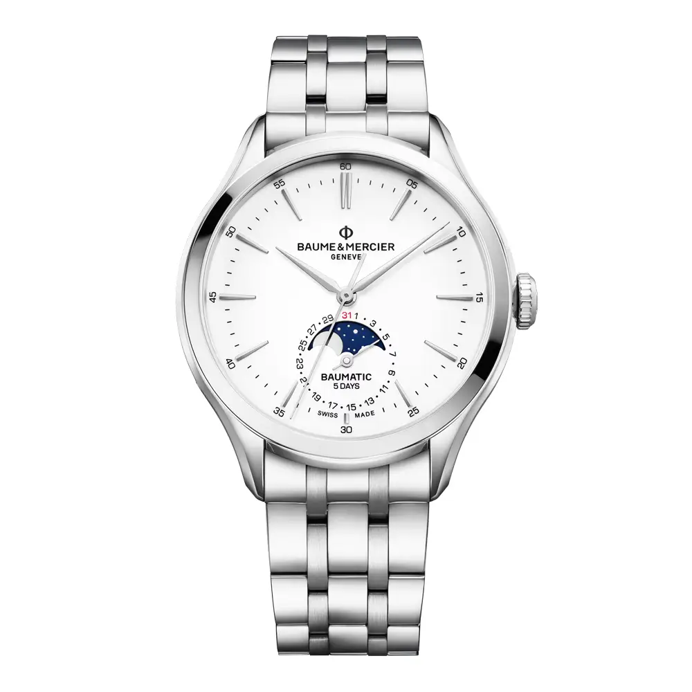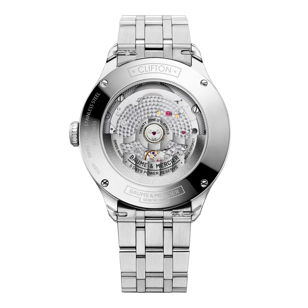 Baume & Mercier Clifton Baumatic M0A10552 — это воплощение элегантности, технической точности и швейцарского мастерства. Корпус из полированной нержавеющей стали диаметром 42 мм придает часам утончённый и универсальный вид, подходящий как для делового стиля, так и для повседневного ношения.