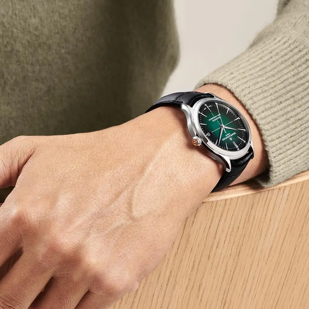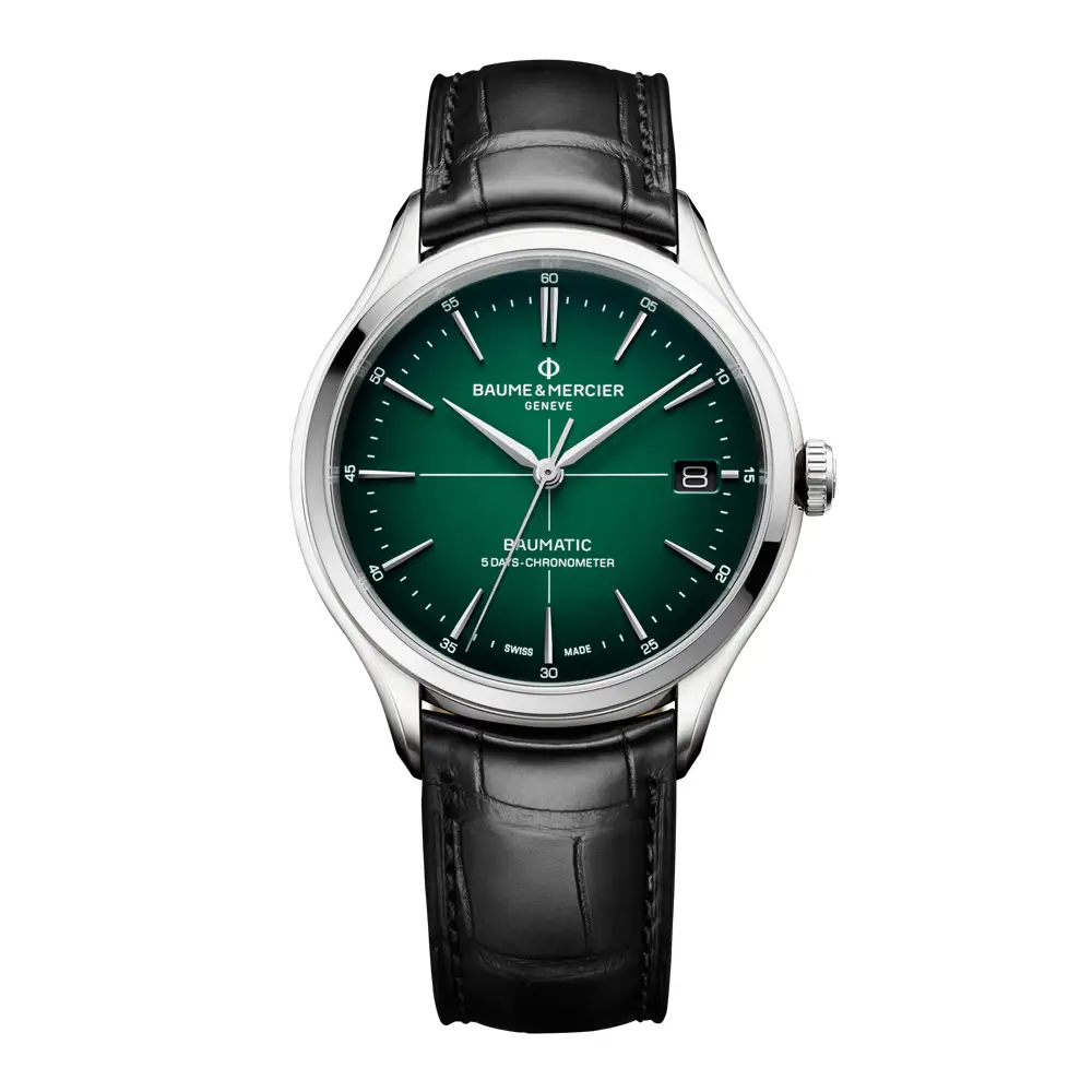 Baume & Mercier Clifton M0A10592 сочетает классическую элегантность с современными технологиями швейцарского часового искусства. Полированный корпус из нержавеющей стали диаметром 40 мм обрамляет зеленый циферблат с градиентным эффектом и крестовым узором, дополненный родированными стрелками. Черный ремешок из кожи аллигатора подчеркивает сдержанный и благородный стиль модели.