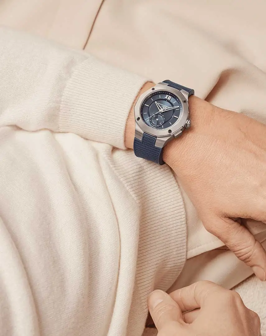 Прочный круглый корпус диаметром 43 мм из нержавеющей стали украшен выразительным двенадцатигранным безелем, фирменным элементом коллекции Riviera, подчеркивающим индивидуальность модели. Сапфировое стекло защищает элегантный синий аналоговый циферблат, отличающийся чистым и хорошо читаемым оформлением.