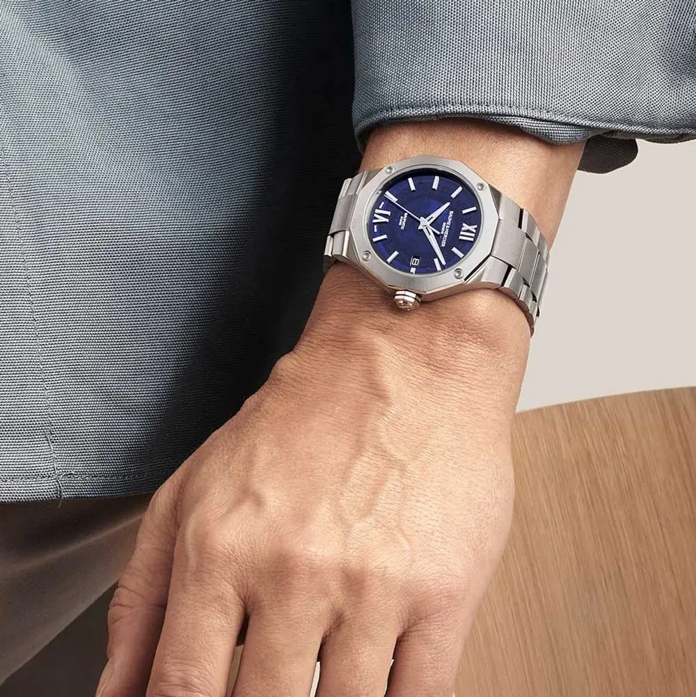 Корпус из нержавеющей стали диаметром 42 мм дополнен двенадцатигранным безелем, придающим часам узнаваемый вид. Синий циферблат с волнообразной текстурой, защищённый сапфировым стеклом, оснащён окном даты на 3 часах и отличается превосходной читаемостью.