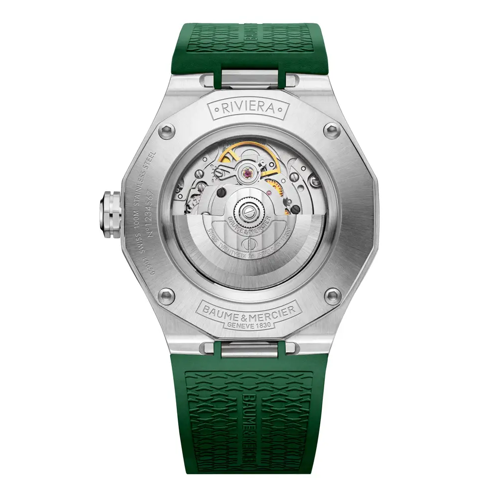 Внутри установлен автоматический механический калибр, обеспечивающий плавный и точный ход. Зелёный каучуковый ремешок с раскладывающейся застёжкой подчёркивает спортивный характер модели и обеспечивает комфорт при носке. С водонепроницаемостью 10 ATM (100 м) часы Baume & Mercier Riviera M0A10618 идеально подойдут для активного образа жизни и стильного повседневного ношения.