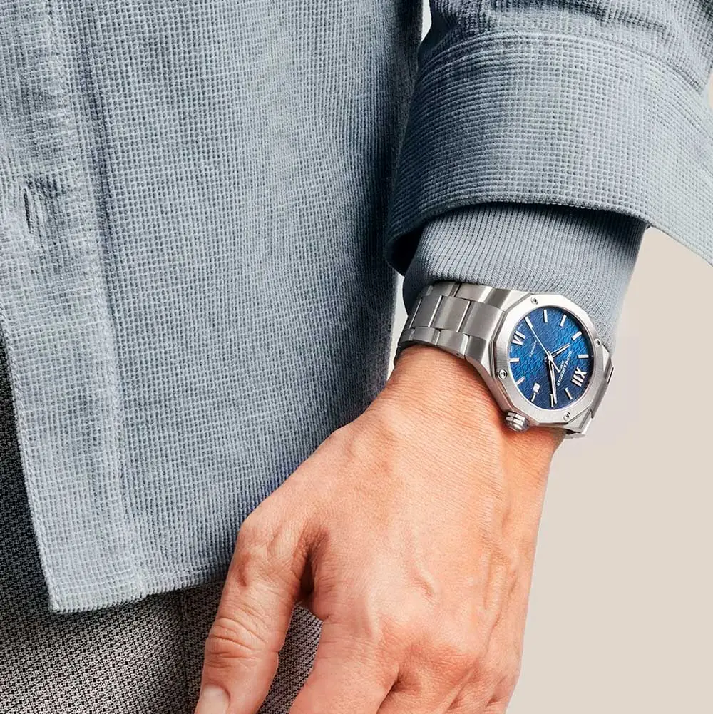 Корпус из нержавеющей стали диаметром 42 мм защищён сапфировым стеклом, которое предохраняет синий текстурированный циферблат и обеспечивает отличную читаемость. Окно даты на 3 часах добавляет удобство в повседневном использовании, не нарушая гармонии дизайна.