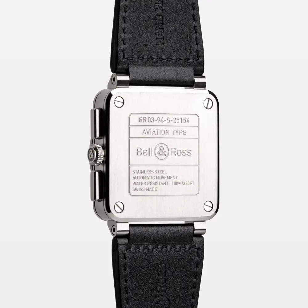 Внутри установлен автоматический калибр BR-CAL.301 с функциями хронографа и даты, обеспечивающий запас хода около 42 часов. Водонепроницаемость 100 м (10 ATM) и чёрный кожаный ремешок с классической пряжкой делают BR 03-94 Black Steel идеальным сочетанием элегантности, производительности и надёжности.