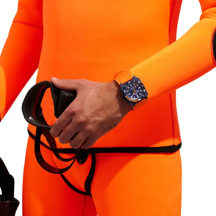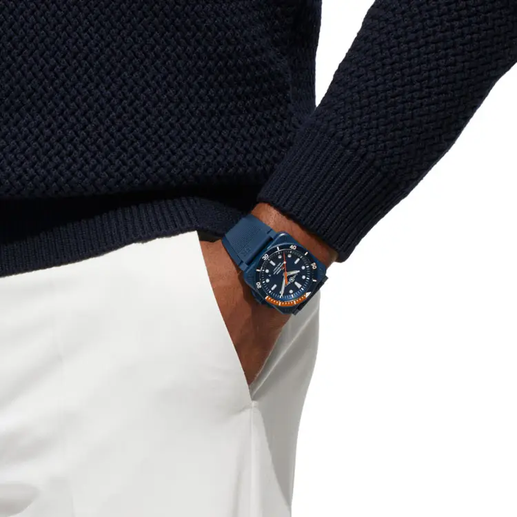 Внутри установлен механический автоматический калибр, обеспечивающий точность и надежность. Синий каучуковый ремешок, устойчивый к морской воде, гармонирует с водонепроницаемостью 300 м (30 ATM). BR 03-92 Diver Tara — дань океану и символ приключений.
