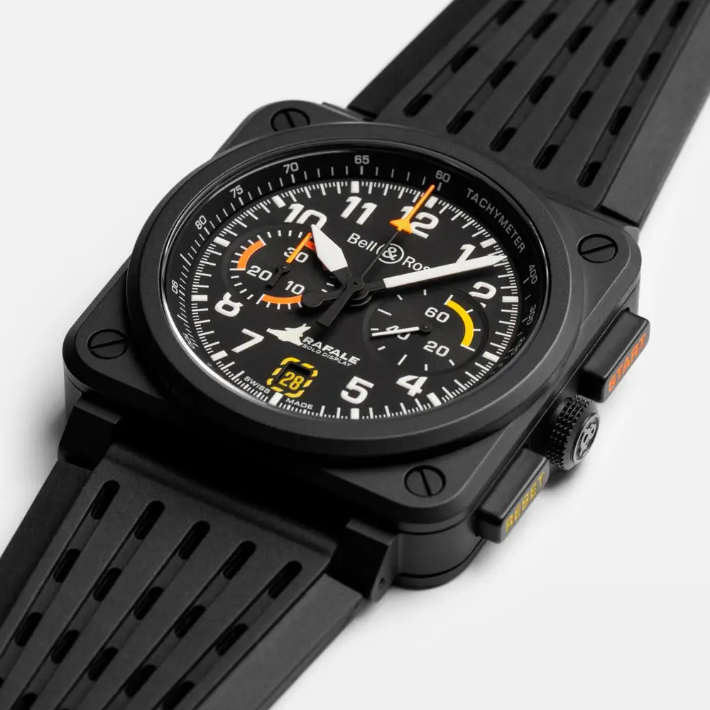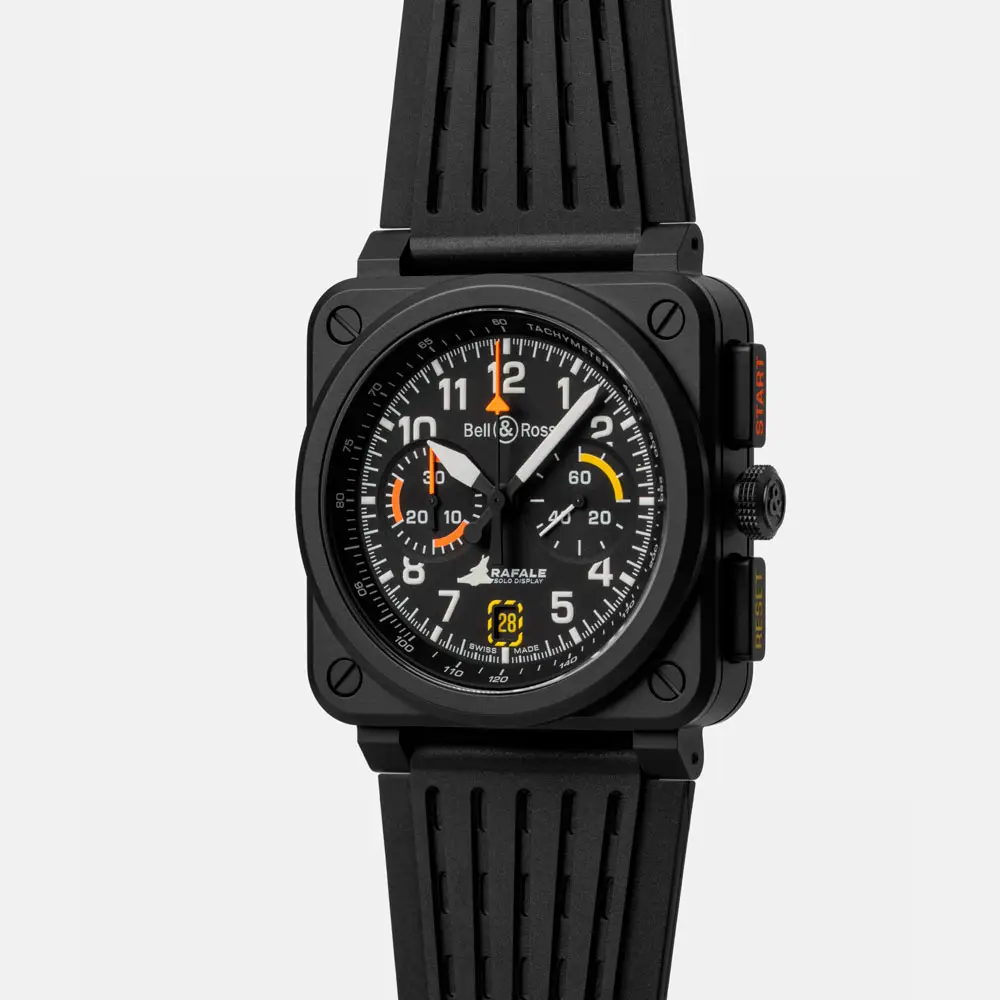 Bell & Ross BR-03 Chrono Rafale Solo Display — лимитированная серия всего 500 экземпляров, созданная в честь престижной пилотажной группы Rafale Solo Display. Корпус диаметром 42 мм, выполненный из микро-пескоструйной чёрной керамики, отличается лёгкостью, прочностью и технической эстетикой.