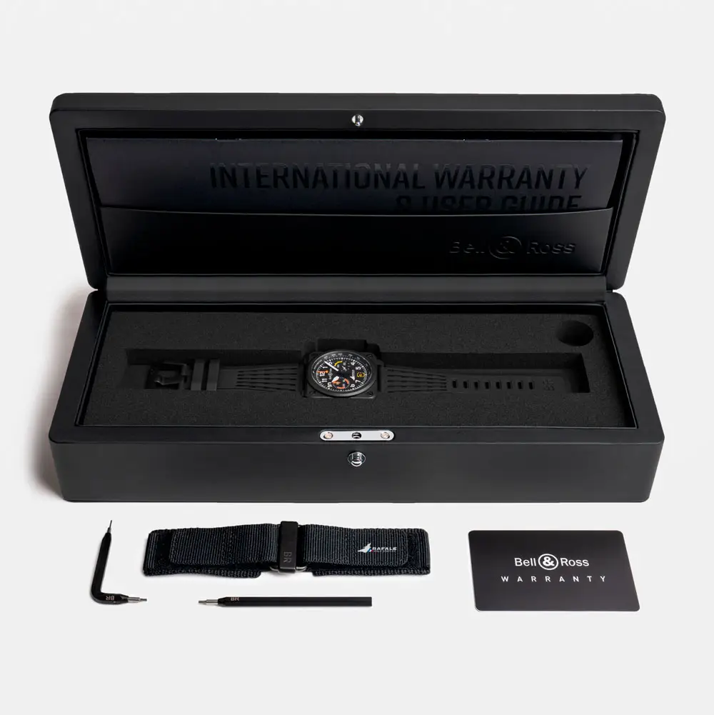 Часы водонепроницаемы до 100 метров и поставляются на прочном каучуковом ремешке, а также с дополнительным текстильным ремнём с эмблемой Rafale Solo Display. BR-03 Chrono Rafale Solo Display сочетает в себе авиационный дух, эксклюзивность лимитированной серии и точность швейцарского часового искусства — идеальный выбор для коллекционеров и поклонников авиации.