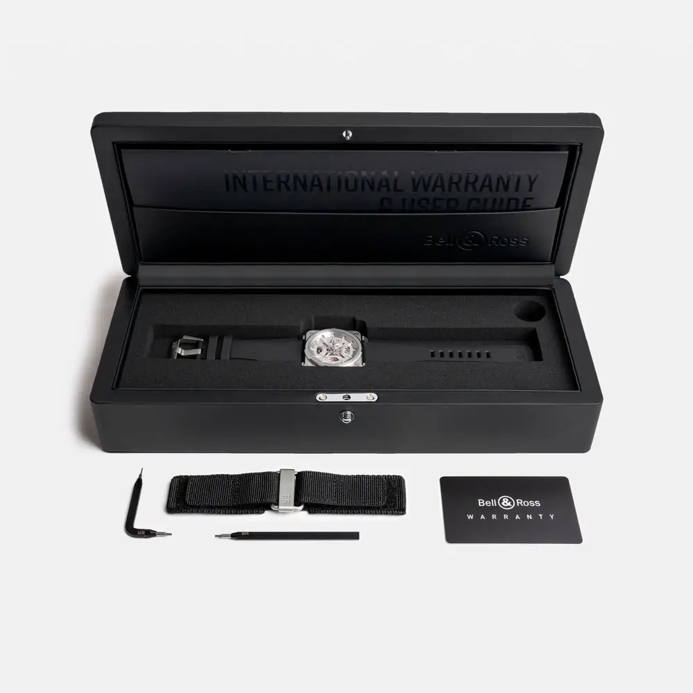 В 41-миллиметровый корпус из матовой нержавеющей стали помещен автоматический механизм BR-CAL.322, за работой которого можно наблюдать через прозрачный скелетонизированный циферблат с серыми элементами. Каждая деталь продумана так, чтобы обеспечить баланс между функциональностью и эстетикой.