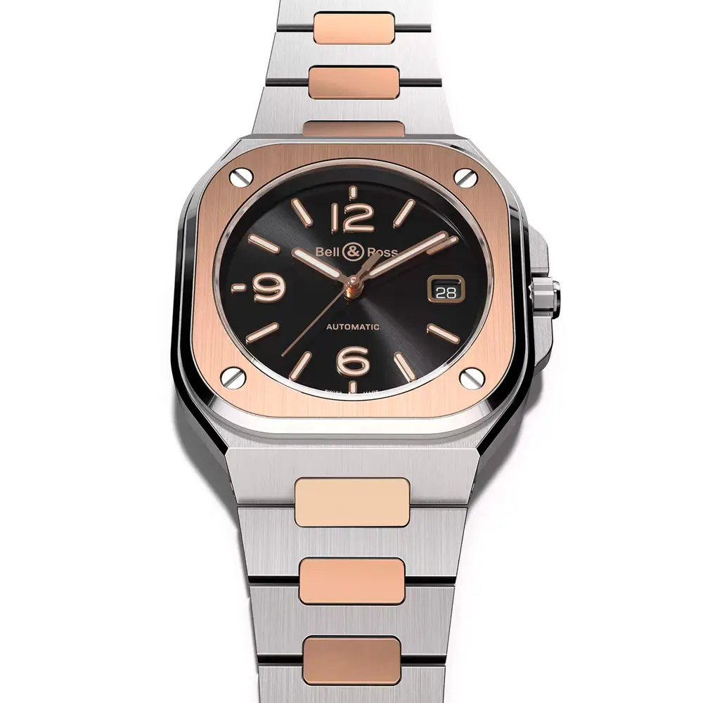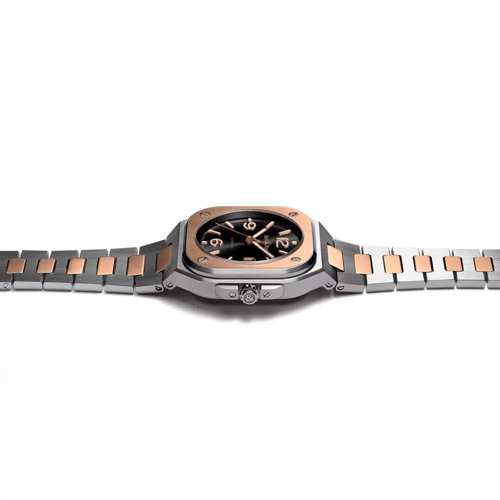 Bell & Ross BR 05 Black Steel & Gold — это сочетание утончённого дизайна и высокого часового мастерства. Круглый корпус диаметром 40 мм выполнен из нержавеющей стали и украшен безелем из розового золота 18 карат, придающим часам элегантность и тепло.