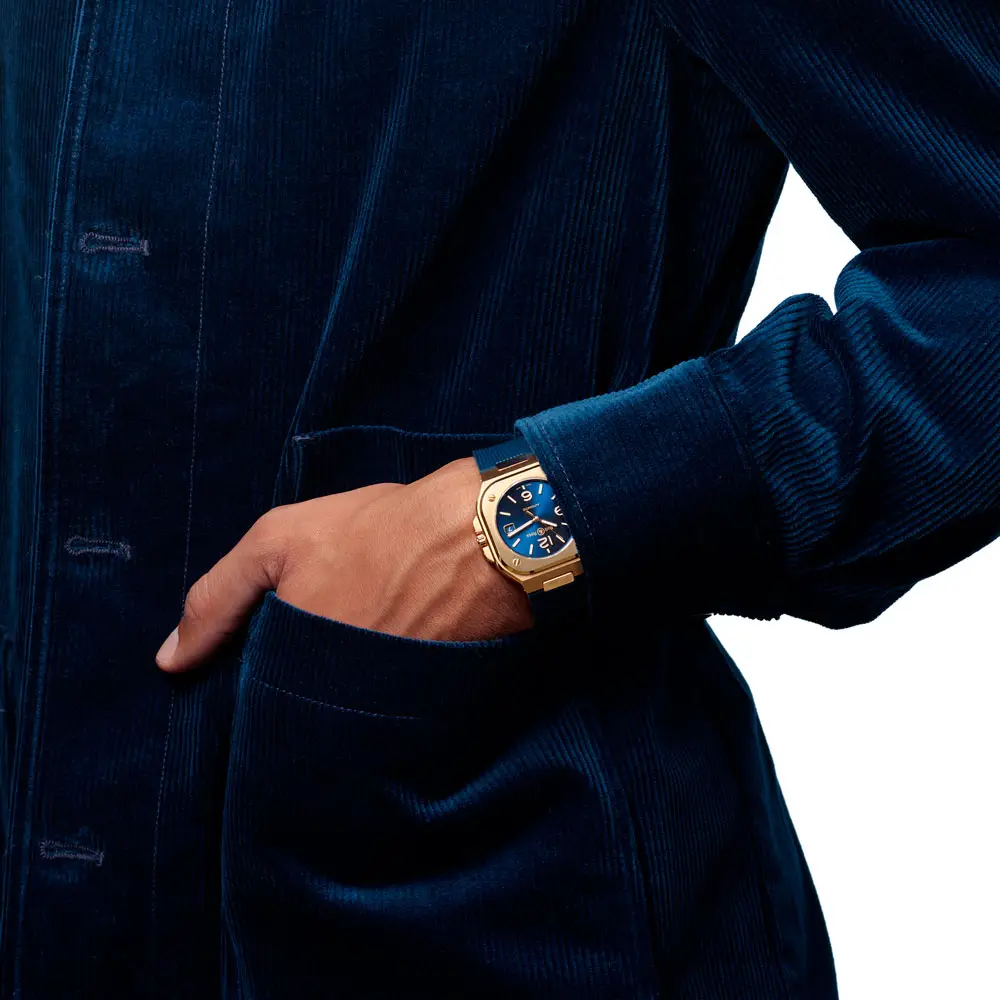 Внутри установлен автоматический калибр BR-CAL.321 с запасом хода около 42 часов, обеспечивающий точность и надёжность. Часы дополнены интегрированным браслетом из розового золота 18 карат с раскладывающейся застёжкой и обладают водонепроницаемостью 100 м (10 ATM). Bell & Ross BR 05 Blue Gold — это символ современной роскоши, элегантности и безупречного мастерства.