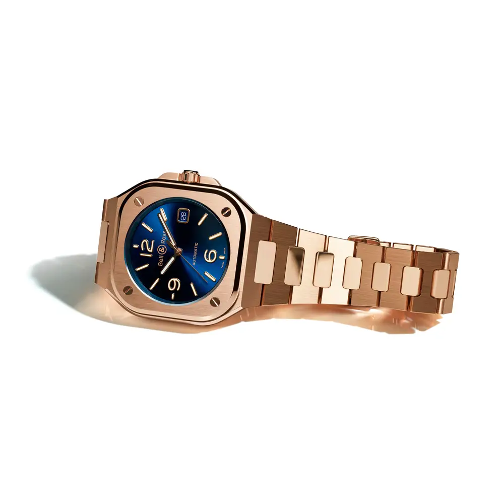 Bell & Ross BR 05 Blue Gold (Ref. BR05A-BLU-PG/SRB) — это воплощение идеального баланса роскоши и технического совершенства, характерного для коллекции BR 05. Модель сочетает тёплое сияние 18-каратного розового золота и синий циферблат с эффектом солнечных лучей, объединяя спортивный стиль с элегантностью.