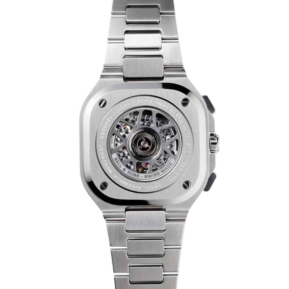 Внутри установлен автоматический калибр BR-CAL.301 с функциями хронографа и даты и запасом хода 42 часа. Водонепроницаемость 100 м (10 ATM) и стальная раскладывающаяся застёжка обеспечивают комфорт и надёжность. BR 05 Chrono Black Steel — символ силы, точности и современного стиля, идеален для городской жизни и активного ритма.