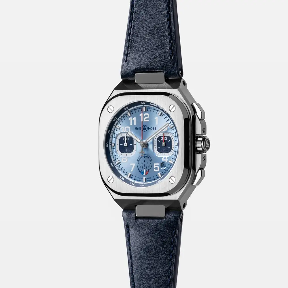 Bell & Ross BR 05 Chrono Patrouille de France (Ref. BR05C-PAF-ST/SCA) — это лимитированная серия, созданная в честь партнёрства Bell & Ross с элитной пилотажной группой Patrouille de France. Модель сочетает спортивную элегантность и авиационное наследие, отражая техническое совершенство и дух неба.