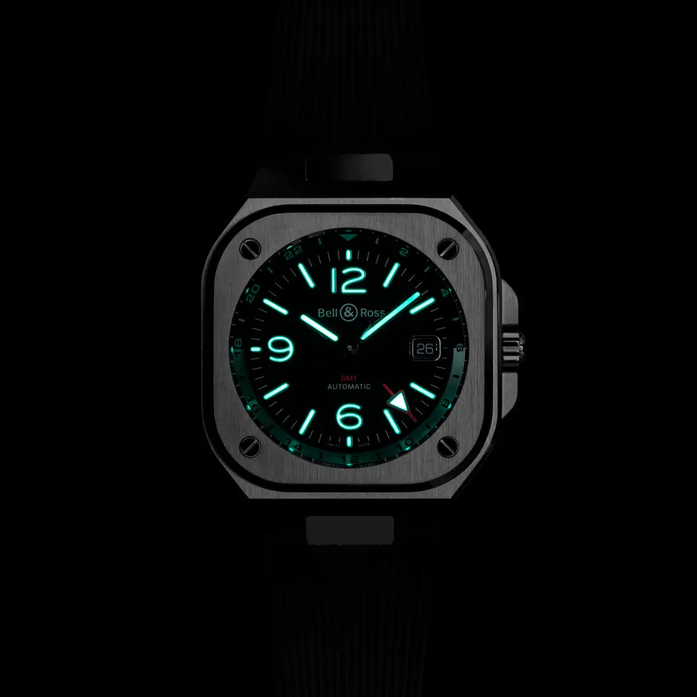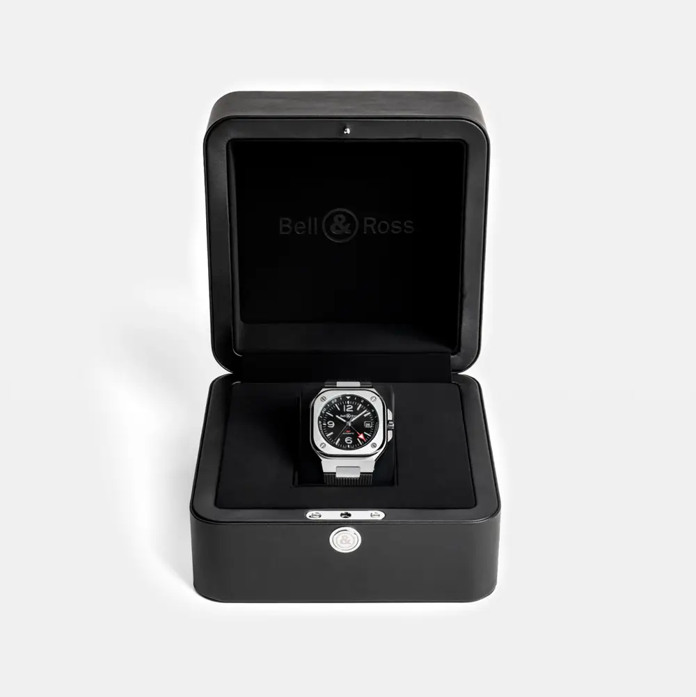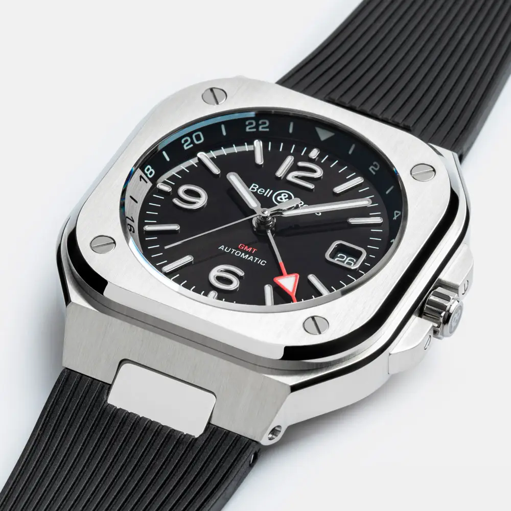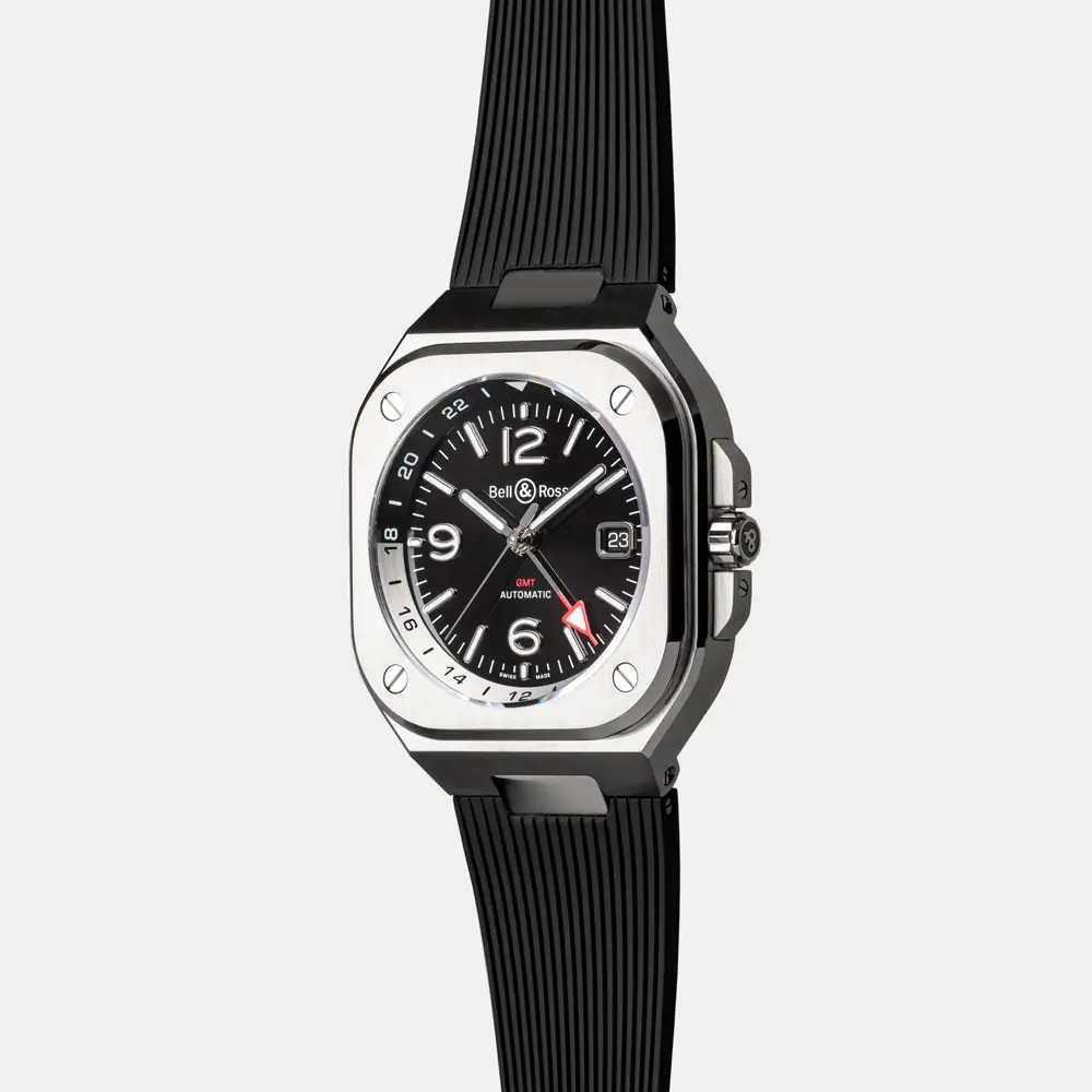 Bell & Ross BR 05 GMT сочетает в себе элегантный дизайн и практичность. Квадратный корпус из нержавеющей стали диаметром 41 мм производит впечатление прочности, а чёрный циферблат с красной GMT-стрелкой позволяет легко отслеживать вторую временную зону.