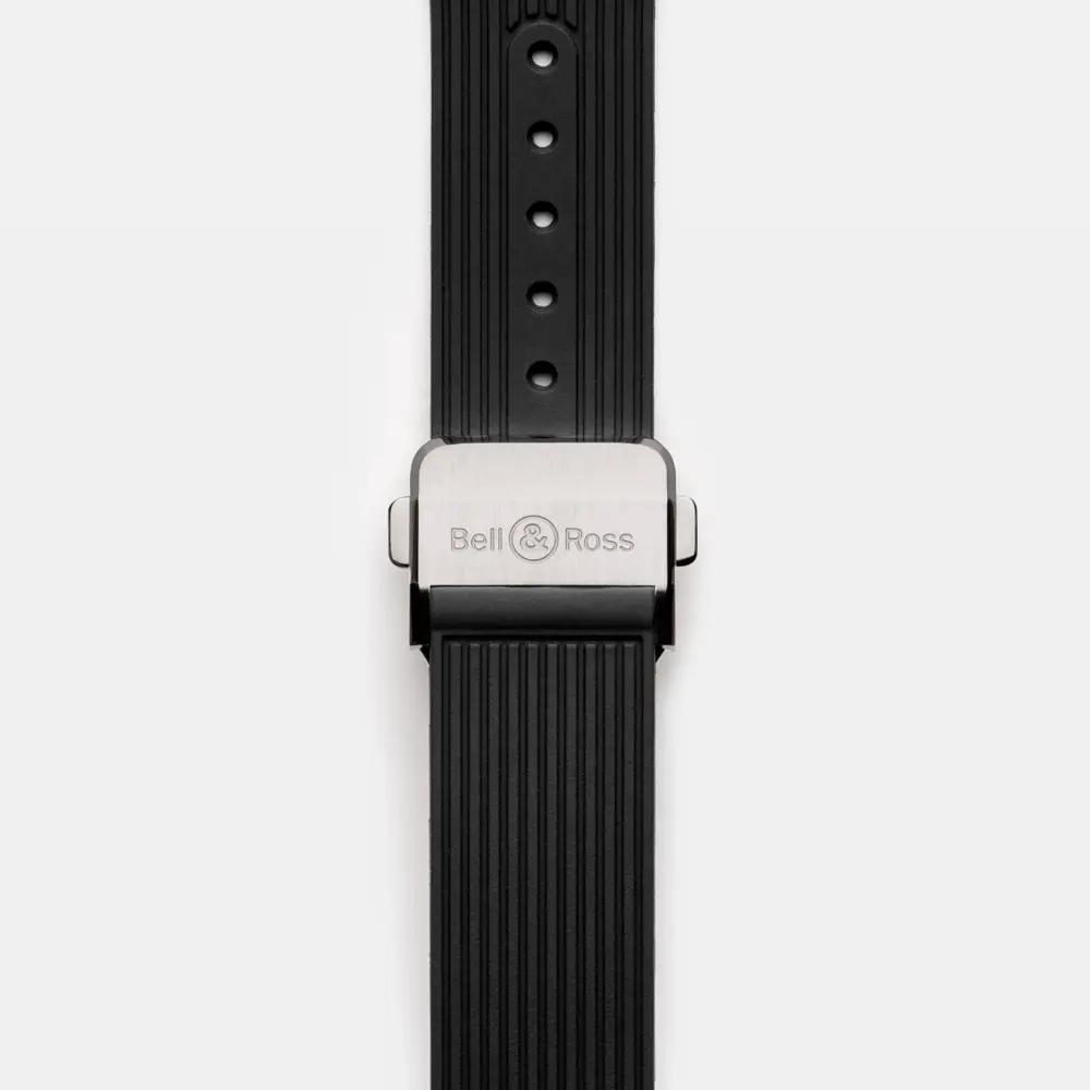 Чёрный каучуковый ремешок с раскладывающейся застёжкой обеспечивает комфорт при ношении и дополняет технический стиль часов.