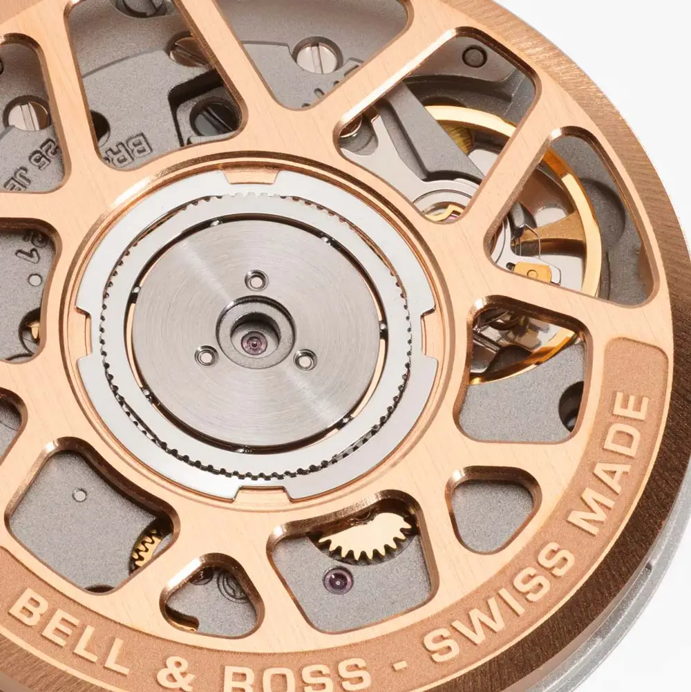 Внутри установлен автоматический калибр BR-CAL.321 с запасом хода около 38 часов, который можно наблюдать через прозрачную сапфировую заднюю крышку с позолоченным ротором. Функции включают часы, минуты, секунды и индикатор даты, заключённые в корпус толщиной всего 10,33 мм.