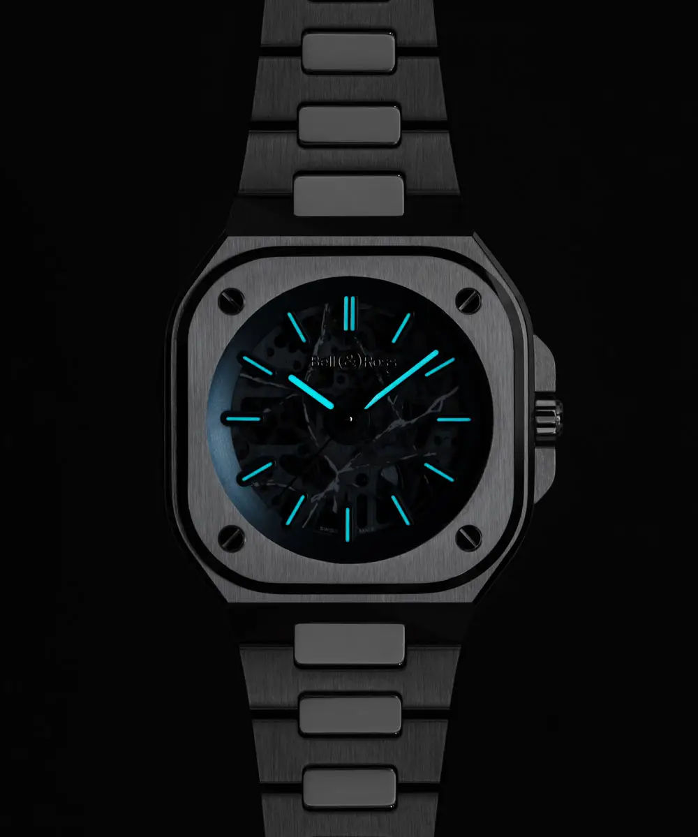 Сердцем часов является автоматический калибр BR-CAL.322-1 с частотой 4 Гц и запасом хода до 54 часов, полностью раскрывающийся благодаря скелетонизации и прозрачному сапфировому циферблату. Интегрированный стальной браслет плавно соединяется с корпусом и обеспечивает максимальный комфорт при ношении.