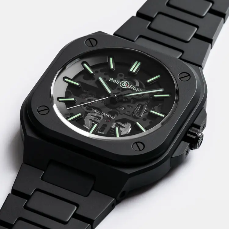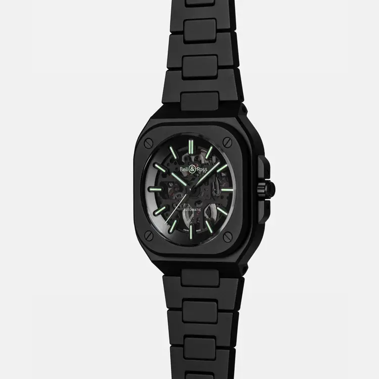 Bell & Ross BR 05 Skeleton Black Lum Ceramic сочетает футуристический дизайн, современные материалы и идеальную читаемость днём и ночью. Скелетонизированный циферблат с люминесцентными элементами и матовая чёрная керамика создают технически совершенную и визуально впечатляющую модель.