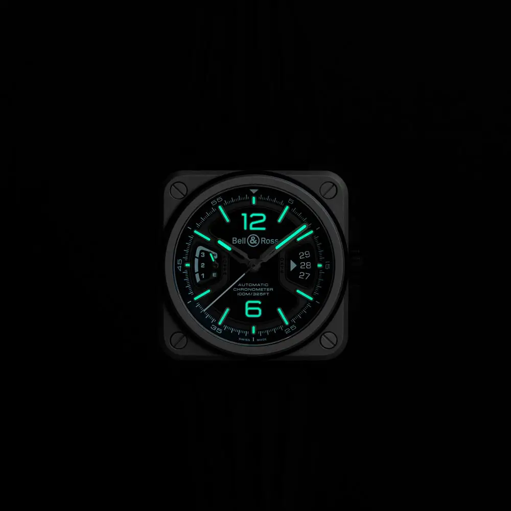 Внутри работает автоматический калибр BR-CAL.323, созданный в сотрудничестве с Kenissi. Этот механизм имеет сертификацию COSC и обеспечивает запас хода до 70 часов, гарантируя точность и надёжность. На структурированном чёрном циферблате расположены индикатор запаса хода на 9 часах и окно даты на 3 часах.
