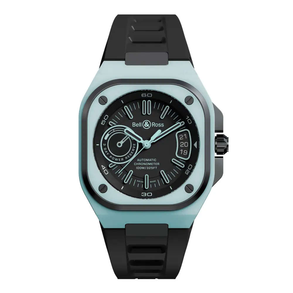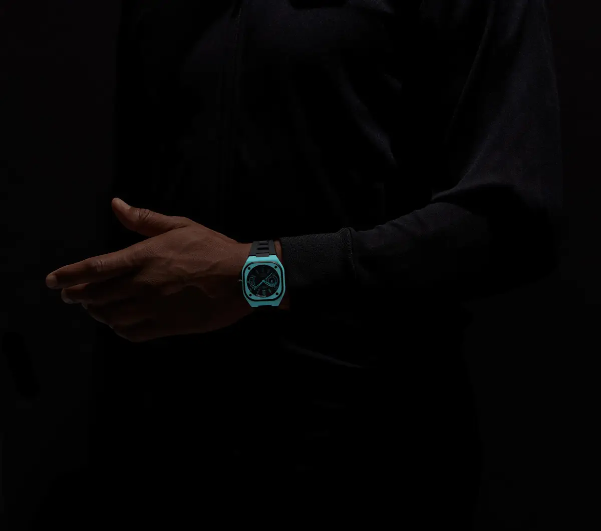 Bell & Ross BR-X5 Blue Lum (Ref. BRX5R-BLUM-TC/SRB) — это футуристическое воплощение современного часового искусства, объединяющее технические инновации, точную конструкцию и выразительный дизайн. Эта лимитированная модель отличается уникальным характером и превосходной читаемостью благодаря использованию современных материалов и светящихся элементов.
