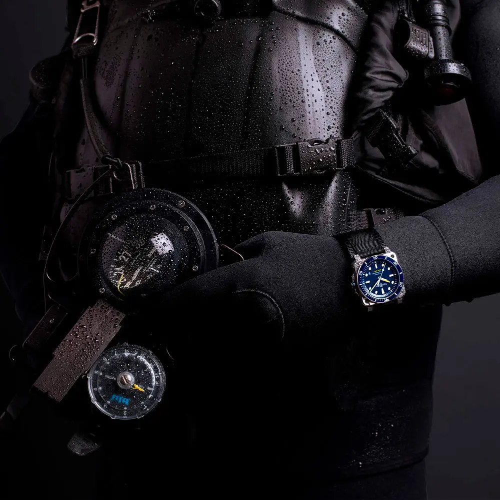 Корпус из нержавеющей стали диаметром 42 мм выглядит мощно и элегантно. Сапфировое стекло с антибликовым покрытием защищает синий циферблат с люминесцентными стрелками и метками, обеспечивающими отличную читаемость под водой. Однонаправленный вращающийся безель и завинчивающаяся заводная головка подчёркивают профессиональный дух часов.