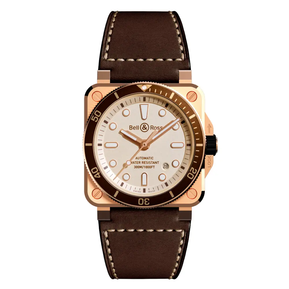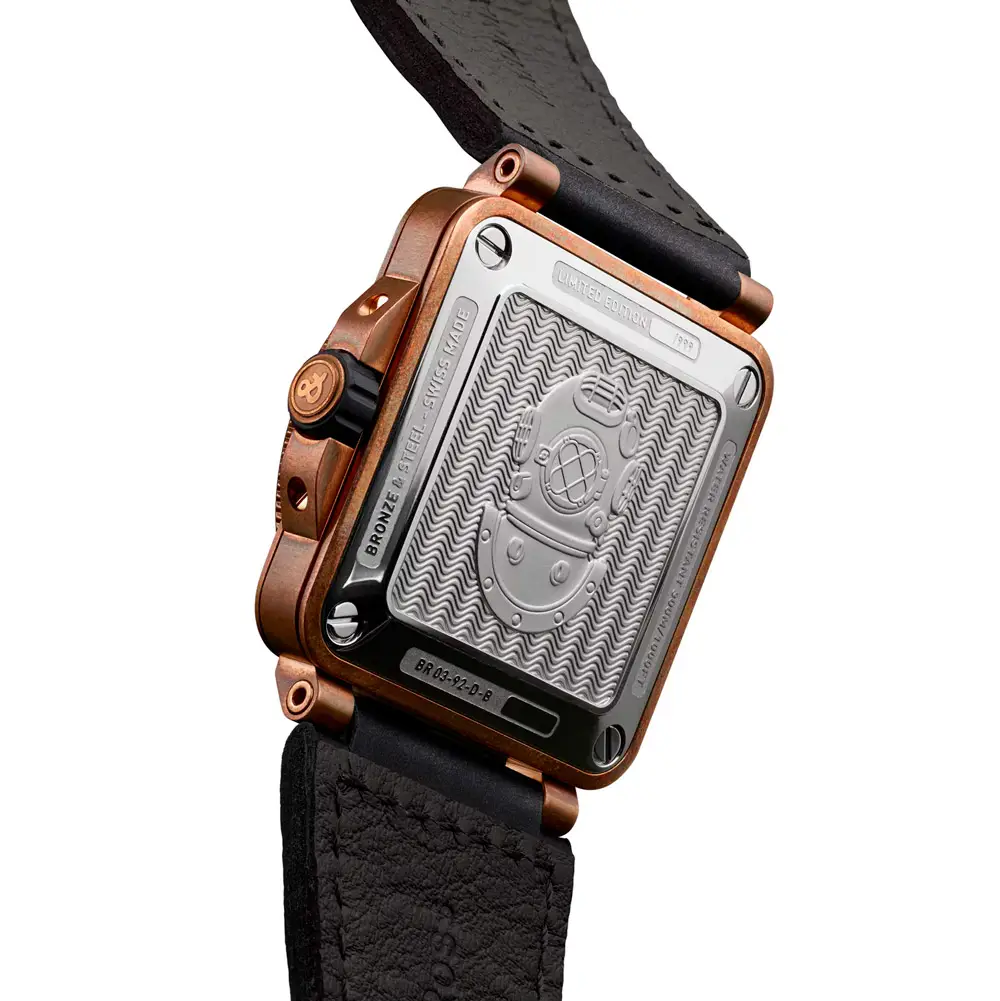 Bell & Ross BR 03-92 Diver White Bronze - исключительная модель для дайвинга, сочетающая в себе техническую прочность и винтажный шарм. Ее характерный квадратный корпус размером 42 × 42 мм изготовлен из бронзового сплава CuSn8 (92% меди и 8% олова), который со временем приобретает характерную патину. Его дополняет однонаправленный вращающийся люнет с коричневым алюминиевым безелем, а завинчивающаяся заводная головка и антибликовое сапфировое стекло обеспечивают водонепроницаемость до 300 метров.