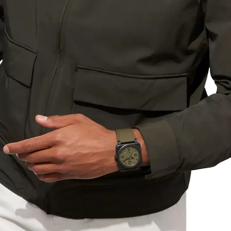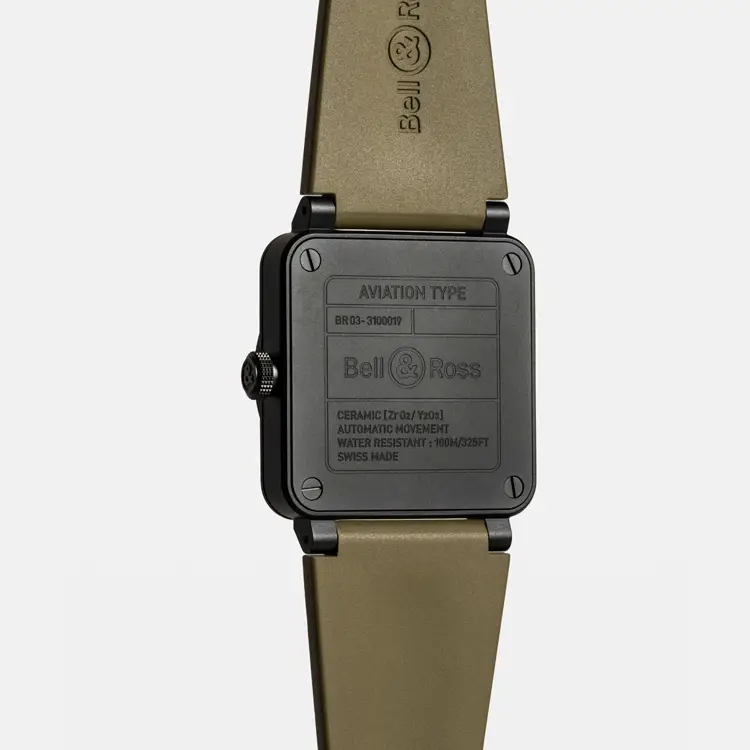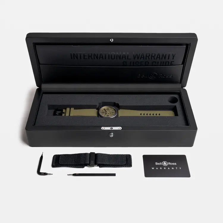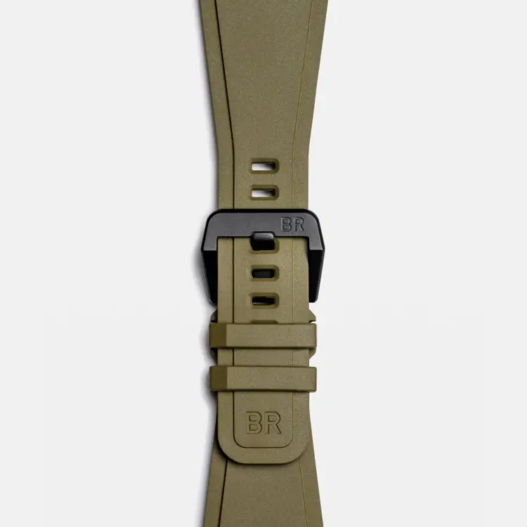 Внутри установлен автоматический калибр BR-CAL.302 с запасом хода 54 часа и окном даты между 4 и 5 часами. Хаки-ремешок из каучука с классической пряжкой подчеркивает военный характер модели. BR 03 Military Ceramic — это символ силы, точности и тактического духа.