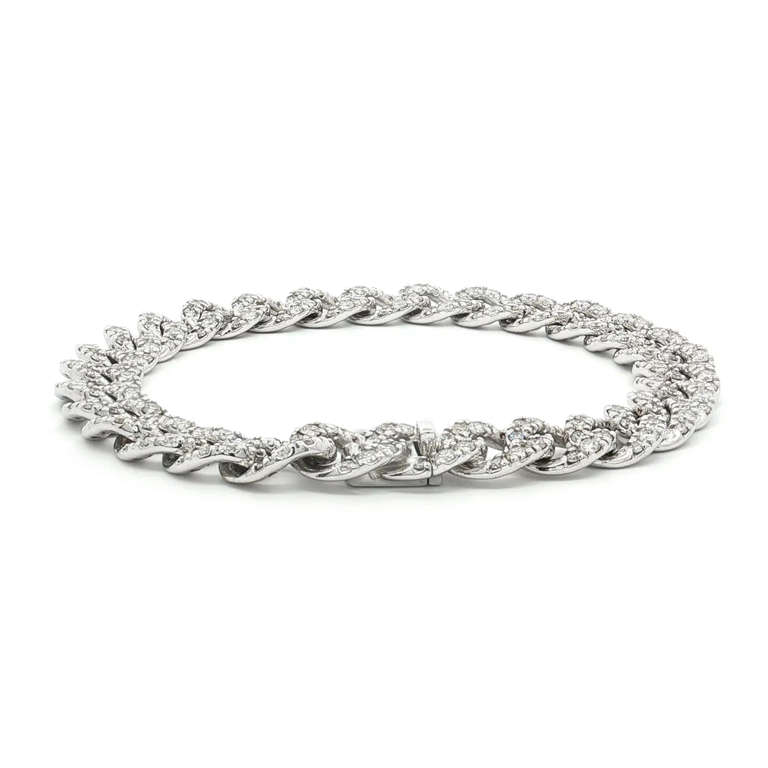 Этот браслет из белого золота с бриллиантами сочетает современный дизайн и роскошь в классическом исполнении. Его объёмные звенья, усыпанные бриллиантами круглой огранки, создают непрерывное сияние и подчеркивают безупречное мастерство исполнения. Каждое звено тщательно отполировано для идеальной посадки и комфорта.