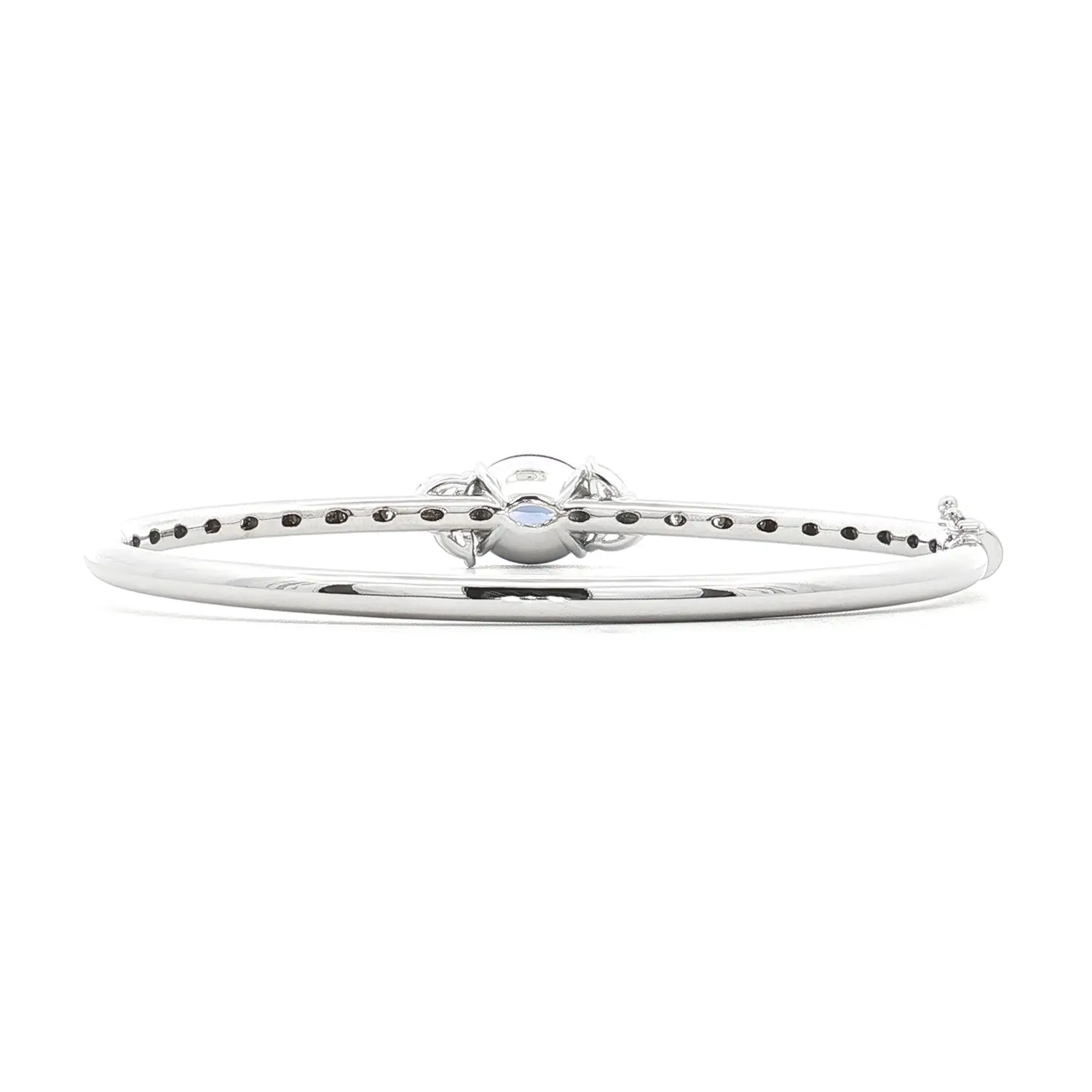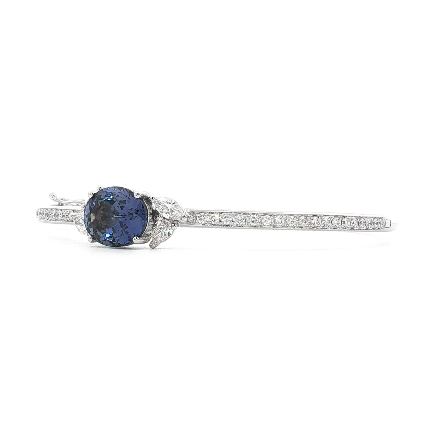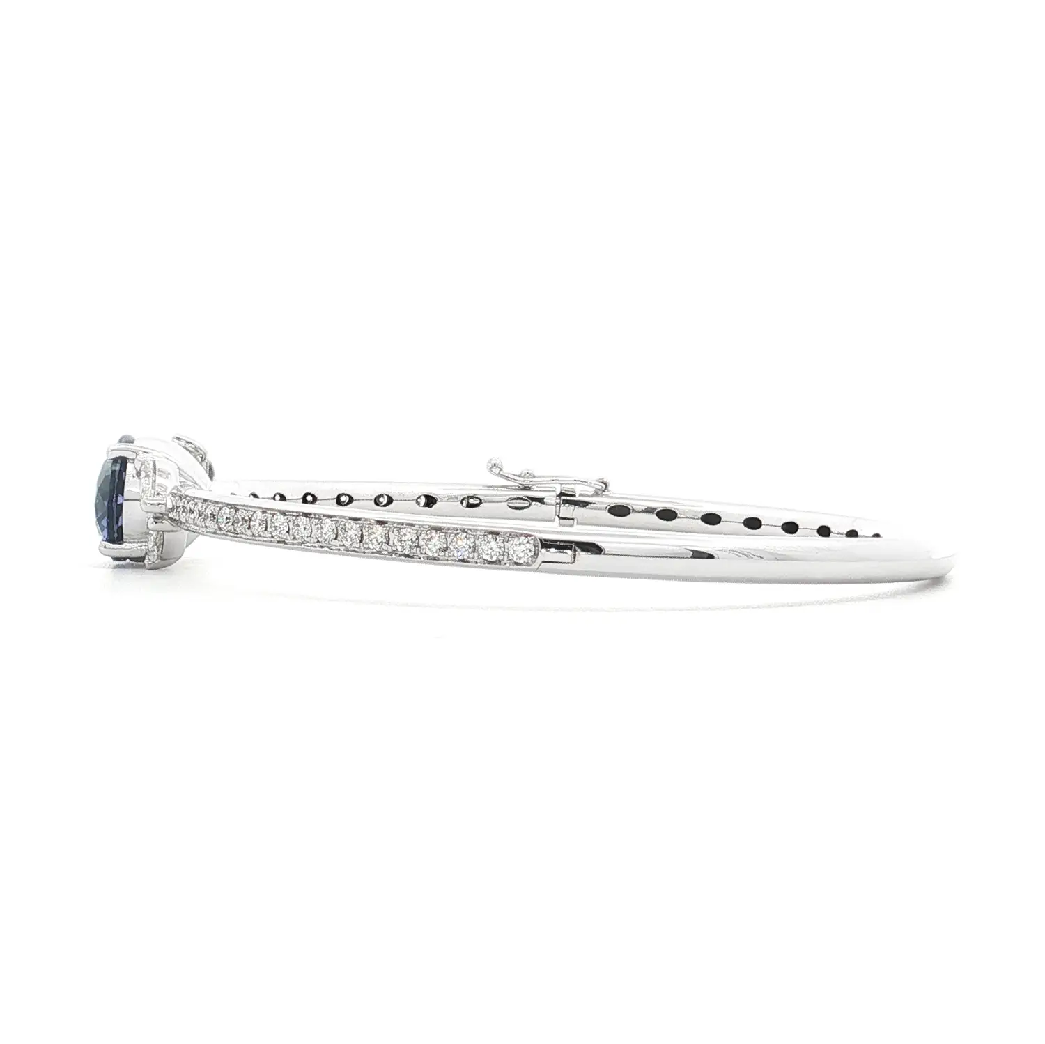 Этот браслет из белого золота — воплощение элегантности и утончённости. В центре композиции расположен танзанит овальной огранки, переливающийся загадочными фиолетово-синими оттенками. С обеих сторон его окружают бриллианты круглой огранки, подчёркивающие глубину цвета и усиливающие сияние камня.