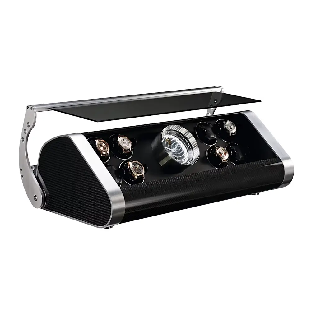 Натяжное устройство Buben & Zorweg Revolution V8 Carbon — это вершина роскошного дизайна и технического совершенства. Эта эксклюзивная модель, рассчитанная на восемь автоматических часов, поражает своим динамичным стилем: корпус выполнен из высокоглянцевого карбона, обрамлён матовым алюминиевым каркасом и оснащён прозрачной дверцей из закалённого стекла, позволяющей любоваться вашей коллекцией.