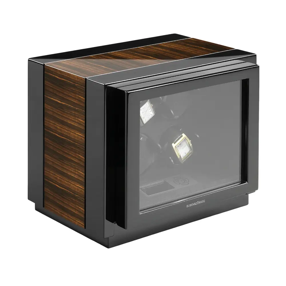 Натяжное устройство Buben & Zorweg VANTAGE 4 Macassar — это идеальное сочетание технической точности, роскошных материалов и вневременного дизайна. Эта модель, рассчитанная на четыре автоматические часы, впечатляет элегантным деревянным корпусом, покрытым глянцевым чёрным лаком и украшенным декоративными вставками из экзотического дерева макассар, создающими эффектный контраст и подчёркивающими утончённость устройства.