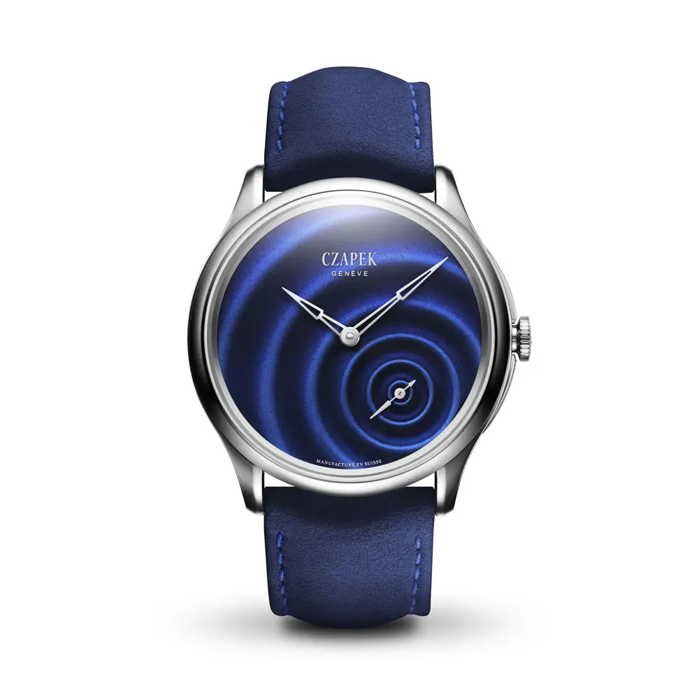 Циферблат с мотивом Goutte D’Eau («капля воды») выполнен в сложной технике Grand Feu эмали, придающей ему глубину и иллюзию движения. Дизайн напоминает круги на воде, расходящиеся от малого секундного циферблата в позиции 4:30, что создаёт эффект живой механики.