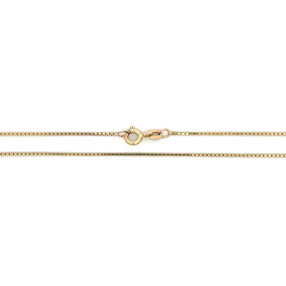Эта изящная цепочка типа Box выполнена из жёлтого золота 14 карат (585/1000) и отличается лаконичным и элегантным дизайном. При длине 50 см и ширине 0,90 мм она идеально подходит как для самостоятельного ношения, так и в качестве дополнения к подвеске.