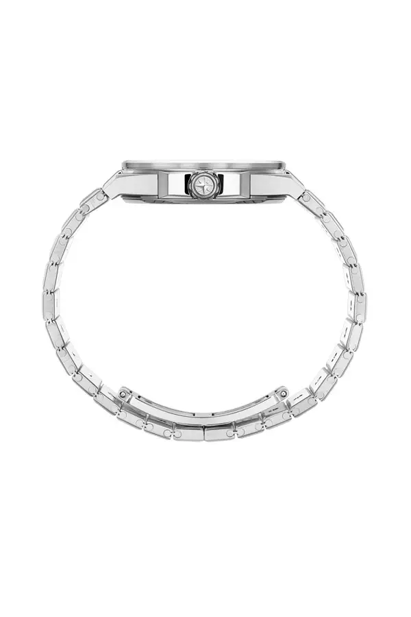 Корпус часов круглой формы изготовлен из нержавеющей стали и имеет диаметр 33 мм. Он идеально сочетается с серебристым стальным браслетом и раскладной застёжкой, обеспечивающей комфорт и надёжную фиксацию на запястье. Синий циферблат, текстура которого напоминает радужку глаза орла, придаёт часам выразительный вид и обеспечивает отличную читаемость.