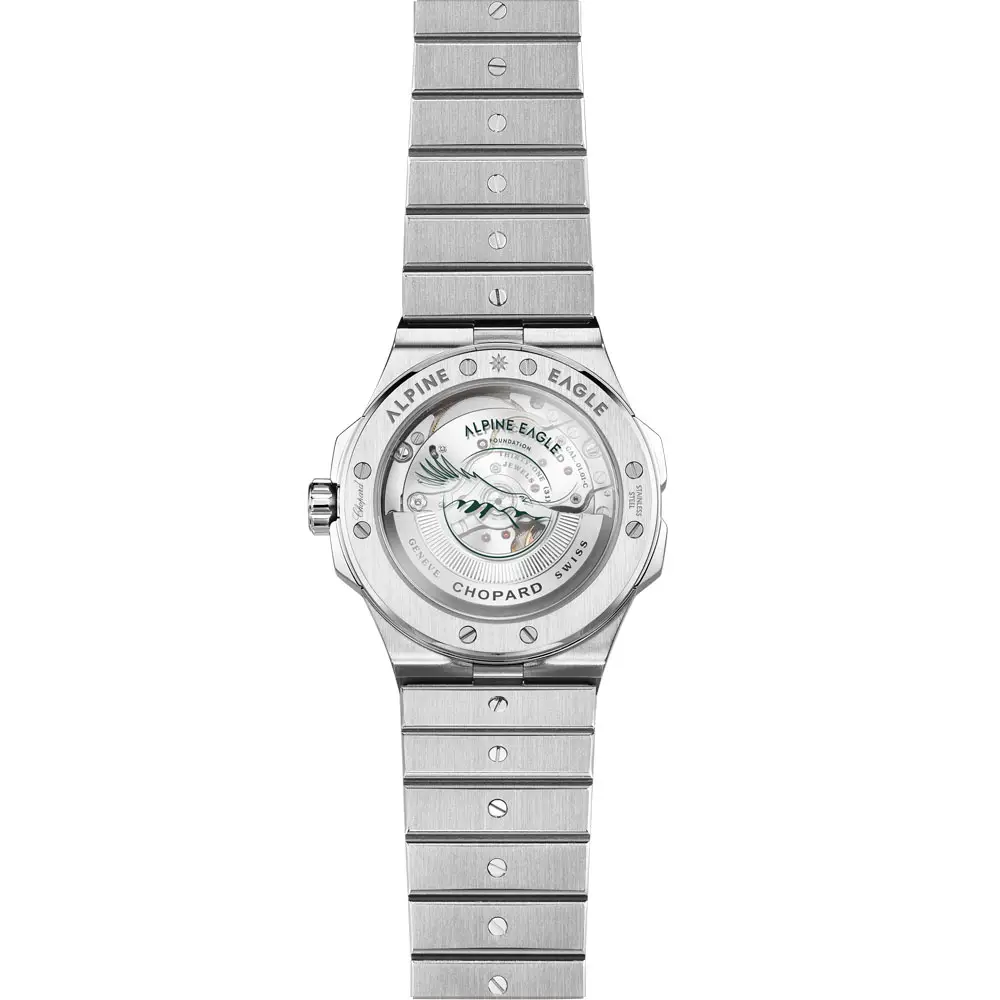 Часы Alpine Eagle сочетают в себе спортивность, утонченность и изысканные материалы. Корпуса и механизмы изготовлены из эксклюзивного сплава Lucent Steel™, разработанного непосредственно Chopard. Этот переработанный и гипоаллергенный материал отличается исключительным блеском и твердостью, сравнимой с золотом.