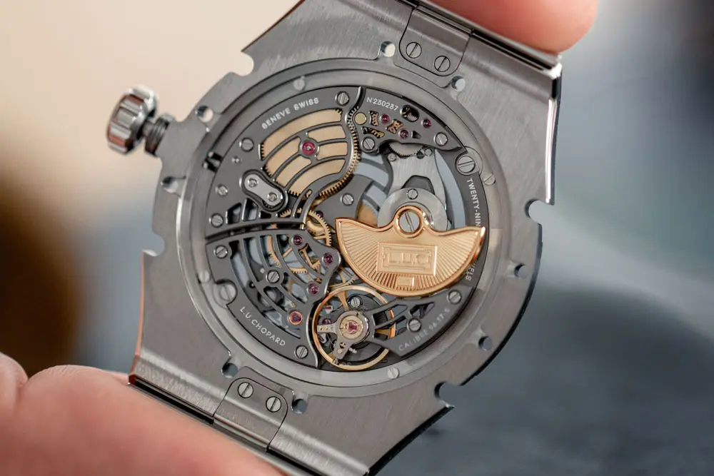 Скелетонизированный циферблат открывает механическое сердце часов — автоматический калибр L.U.C 96.17-S1 с микроротором. Этот ультратонкий механизм обеспечивает запас хода 65 часов и частоту 28 800 пк/час. Сквозь прозрачную заднюю крышку из сапфира можно рассмотреть тончайшую отделку, характерную для Chopard.