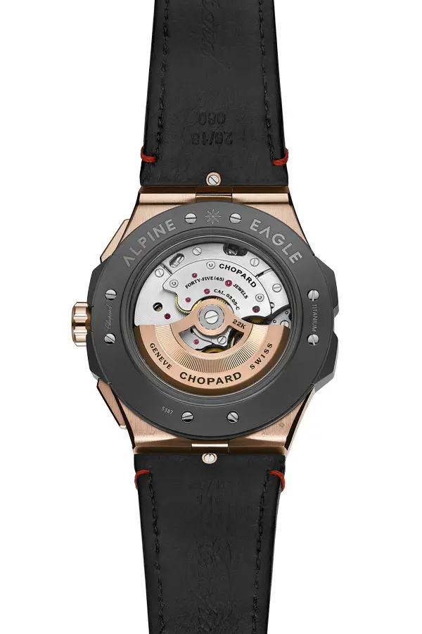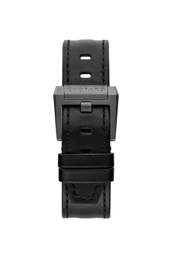 Круглый корпус диаметром 44 мм обрамлён розово-золотым безелем и дополнен чёрным циферблатом с хронографом и функцией даты. Внутри установлен механизм с автоподзаводом Chopard 03.05-C, сертифицированный как хронометр COSC, с запасом хода 60 часов и частотой 28 800 пк/ч (4 Гц).