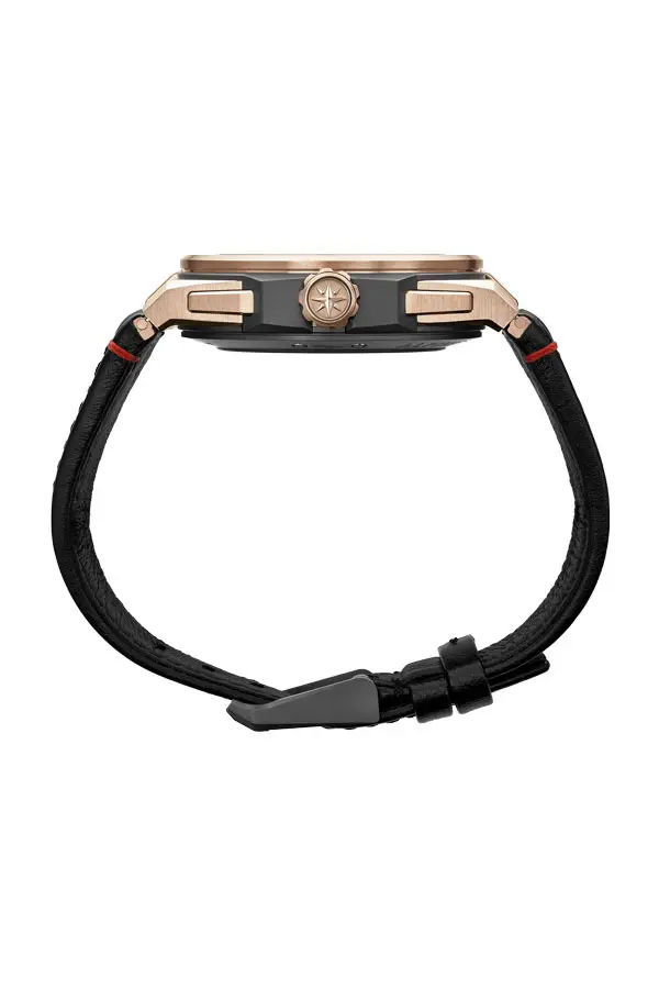 Чёрный кожаный ремешок с раскладывающейся застёжкой обеспечивает комфорт и стиль. Водонепроницаемость 10 ATM (100 м) делает часы подходящими для активной повседневной носки.