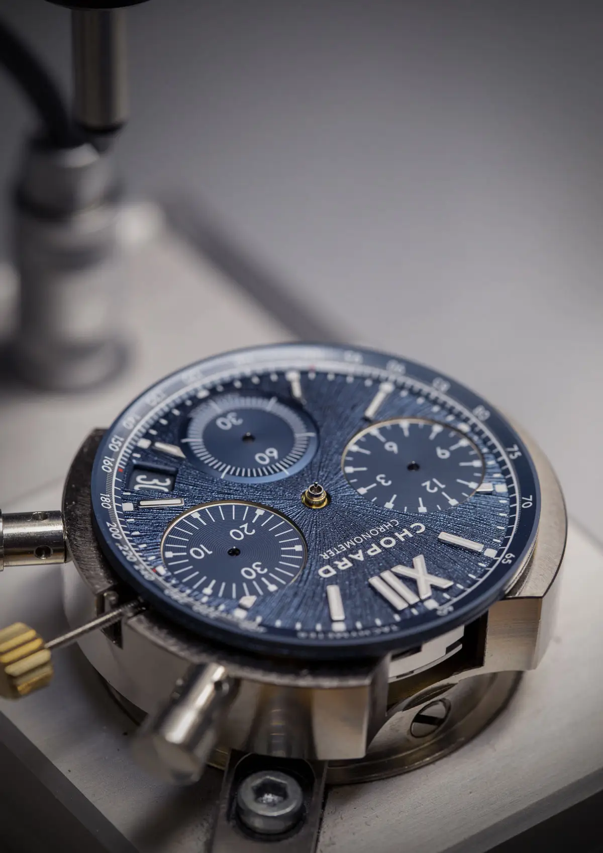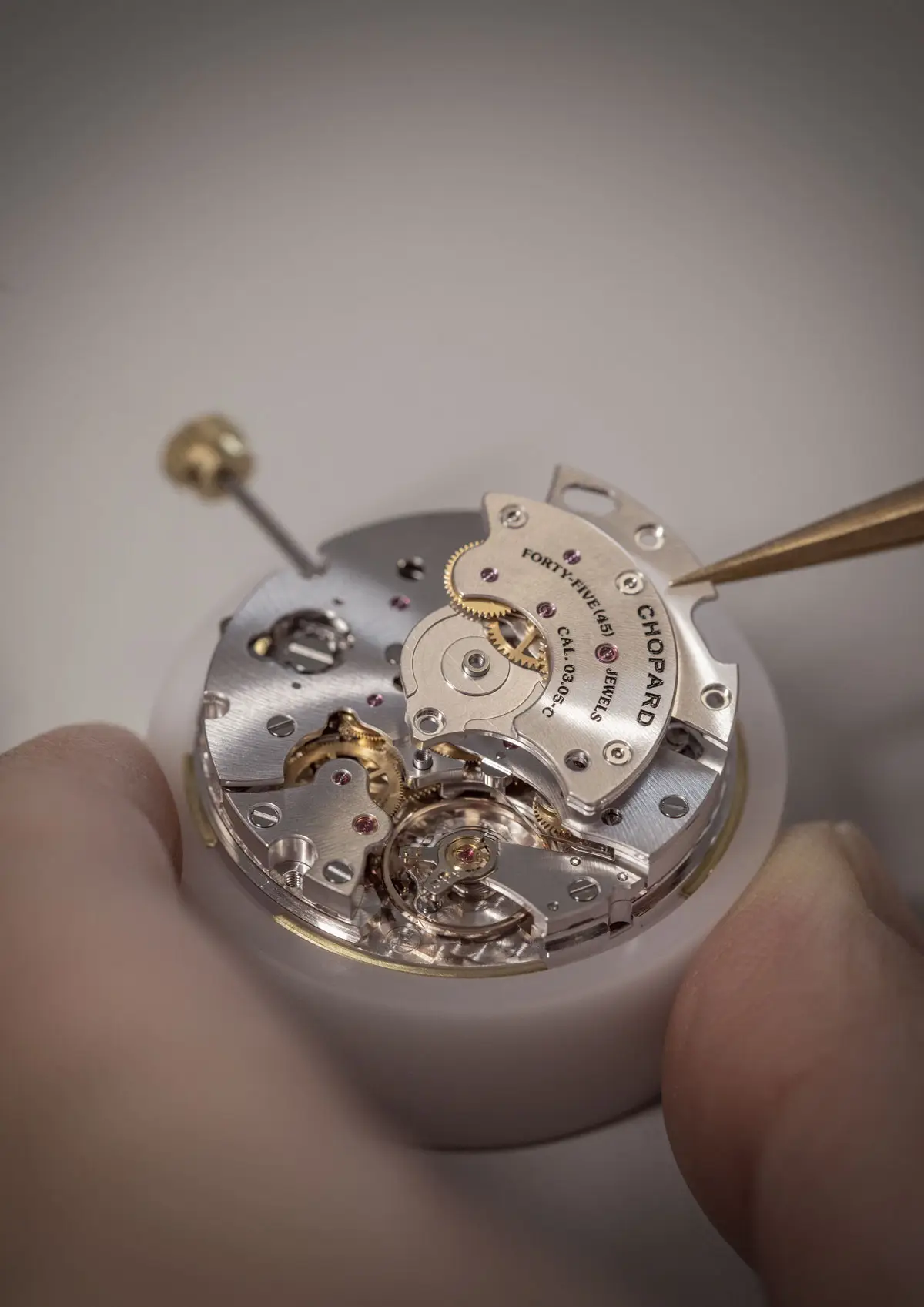 Внутри работает высокоточный механизм Chopard 03.05-C с автоподзаводом, с запасом хода до 60 часов, частотой 28 800 пк/ч (4 Гц) и 45 камнями. Механизм сертифицирован как хронометр COSC.