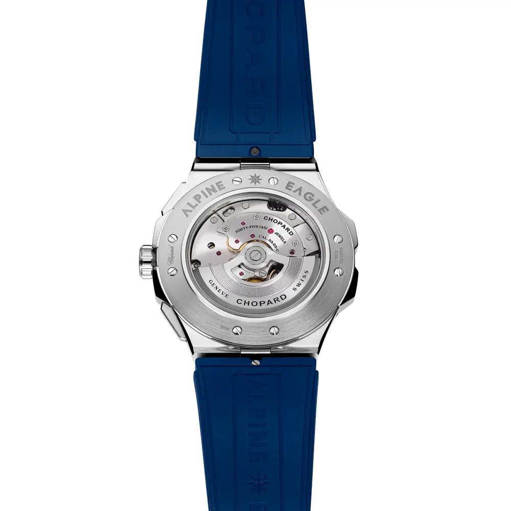 Часы Alpine Eagle сочетают в себе спортивность, утонченность и изысканные материалы. Корпуса и механизмы изготовлены из эксклюзивного сплава Lucent Steel™, разработанного непосредственно Chopard. Этот переработанный и гипоаллергенный материал отличается исключительным блеском и твердостью, сравнимой с золотом.