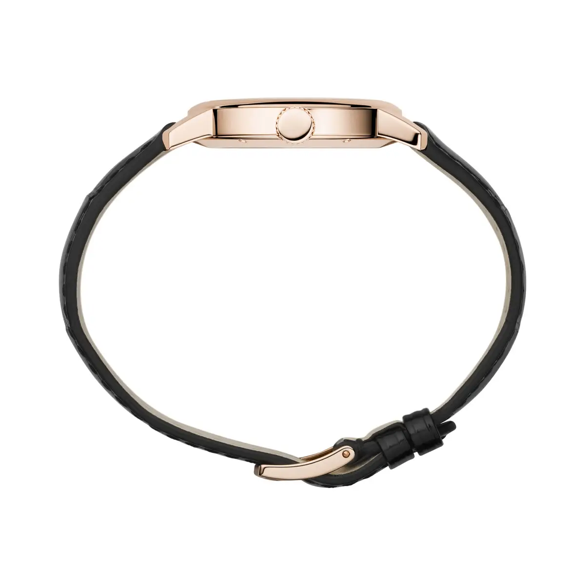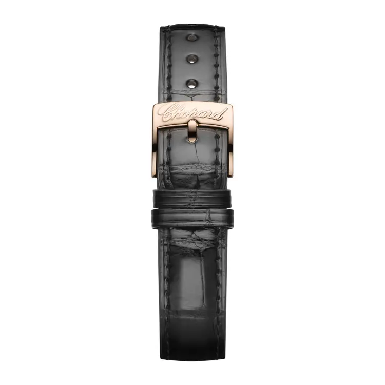 Чёрный ремешок из кожи аллигатора с традиционной пряжкой прекрасно дополняет общий образ. Контраст между ремешком и корпусом из розового золота создаёт гармоничный и утончённый вид.