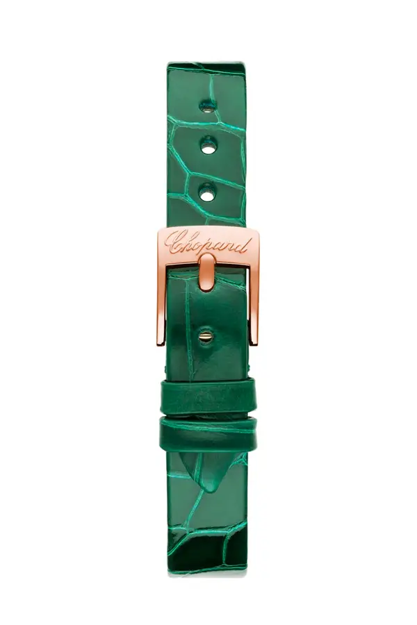 Внутри установлен швейцарский кварцевый механизм, гарантирующий точность и надёжность. Завершает образ ремешок из кожи аллигатора в зелёном цвете, идеально сочетающийся с циферблатом. Chopard Happy Diamonds 203957-5209 — это не просто часы, а символ радости, свободы и вечной элегантности, созданный мастерами Chopard.