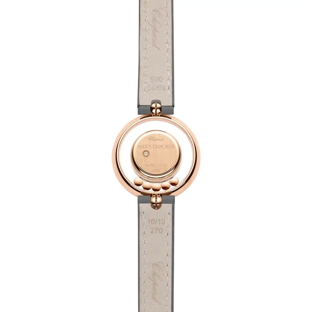 Серый кожаный ремешок с классической пряжкой гармонично сочетается с розовым золотом, подчёркивая элегантность образа. Благодаря водонепроницаемости до 30 метров (3 ATM) часы идеально подходят для повседневного ношения и особых случаев. Chopard Happy Diamonds 209415-5003 — это не просто часы, а украшение, наполненное светом, радостью и изысканным стилем.
