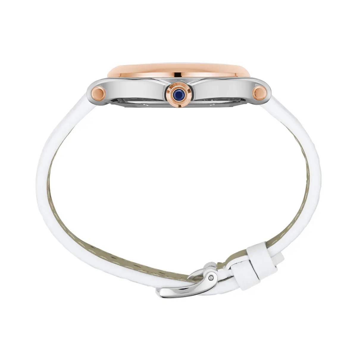 Круглый корпус диаметром 36 мм выполнен из полированной нержавеющей стали, обрамлён безелем из 18-каратного розового золота — нежное и выразительное сочетание. Сапфировое стекло защищает циферблат от царапин, а водонепроницаемость 3ATM / 30M обеспечивает комфорт при повседневном использовании.