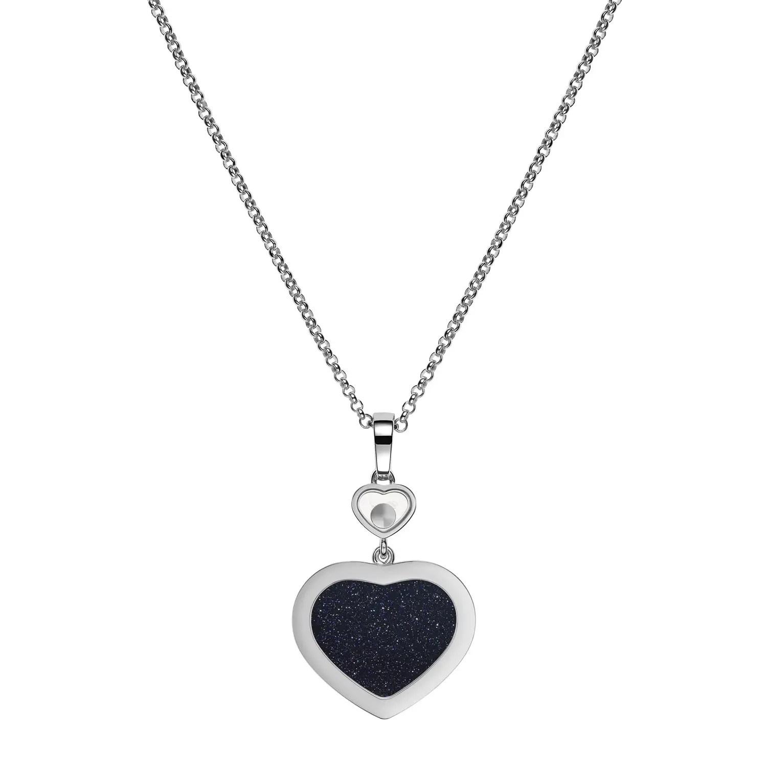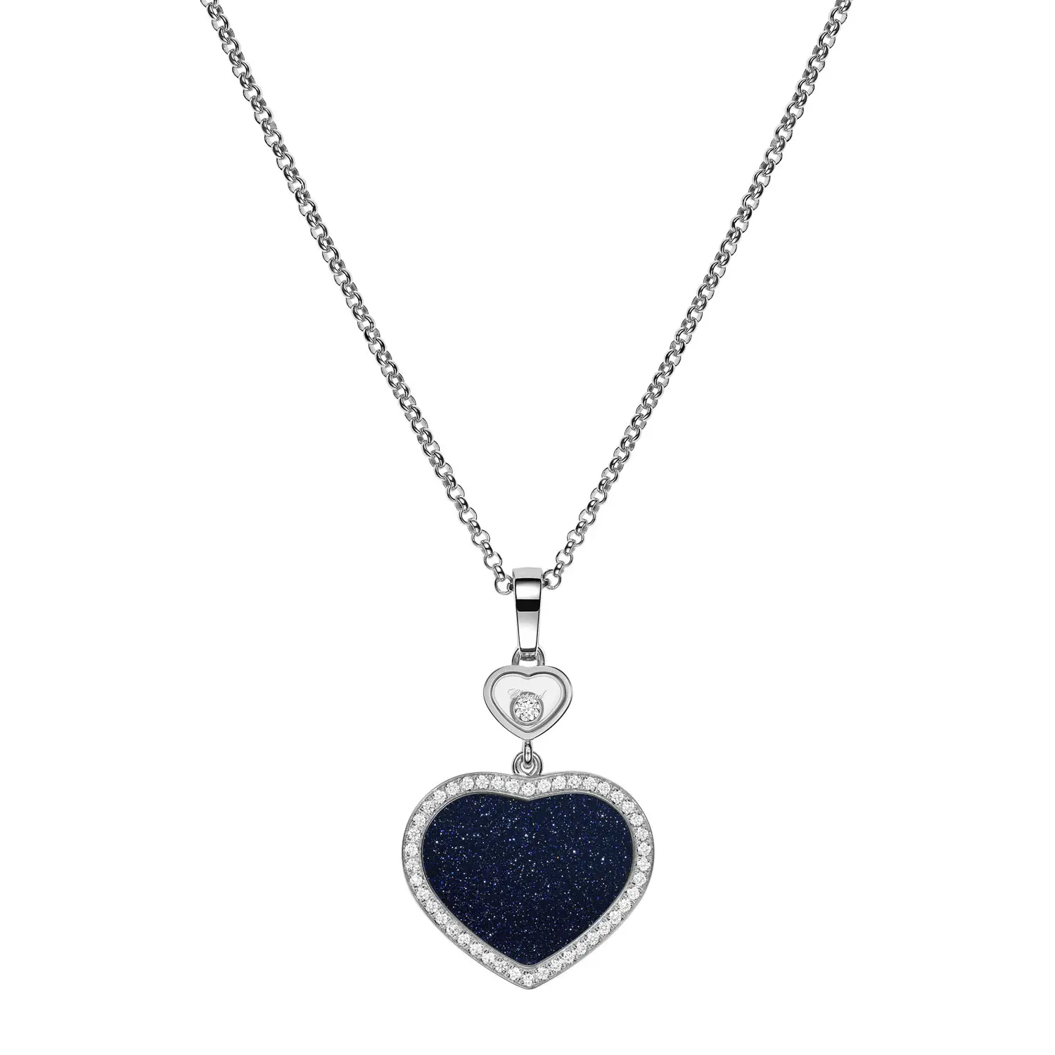 Центральным элементом подвески является синий авантюрин, дополненный бриллиантами, которые придают украшению мягкое сияние и изысканный контраст. Гармоничное сочетание благородных материалов, натурального камня и бриллиантов создаёт образ, сочетающий роскошь и лёгкость.