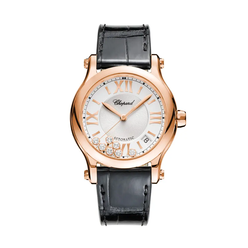 Круглый корпус диаметром 36 мм изготовлен из благородного 18-каратного розового золота, придающего часам теплое сияние и утонченность. Безель из розового золота обрамляет серебристый циферблат, по которому танцуют движущиеся бриллианты – живой символ радости и движения.